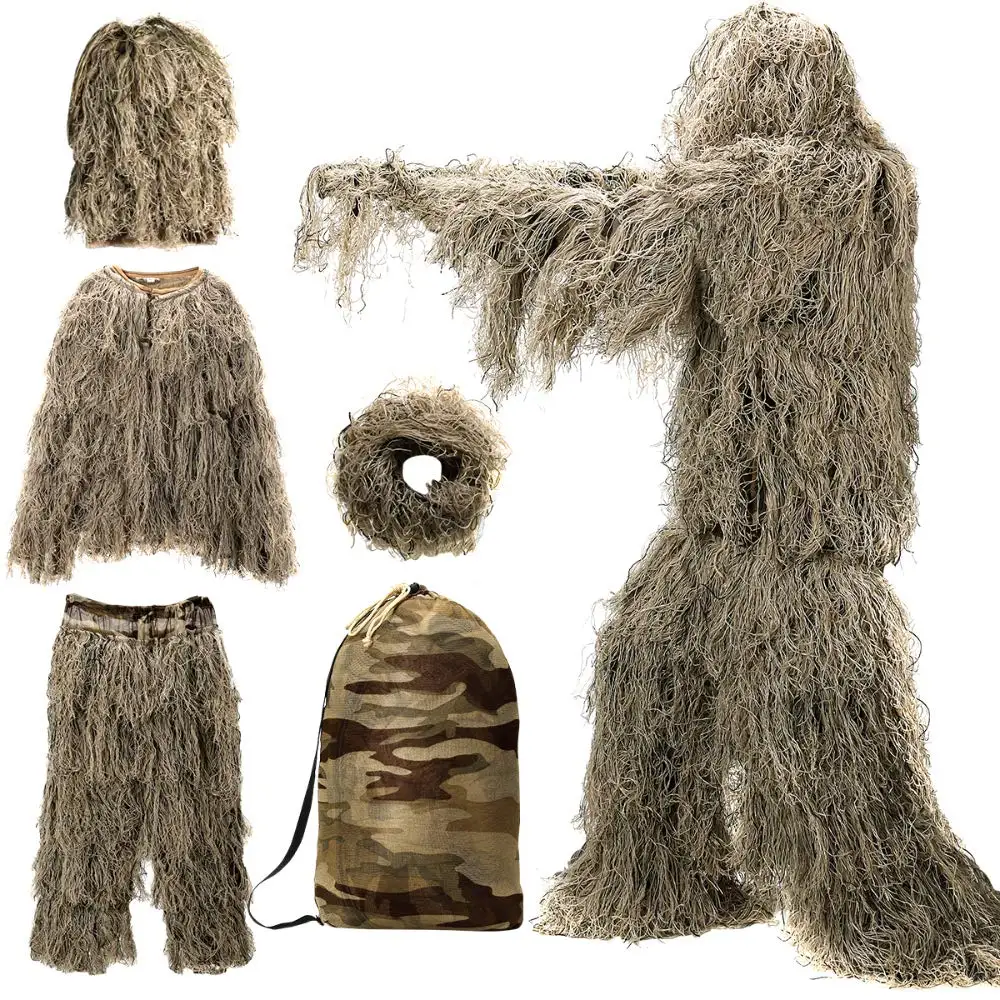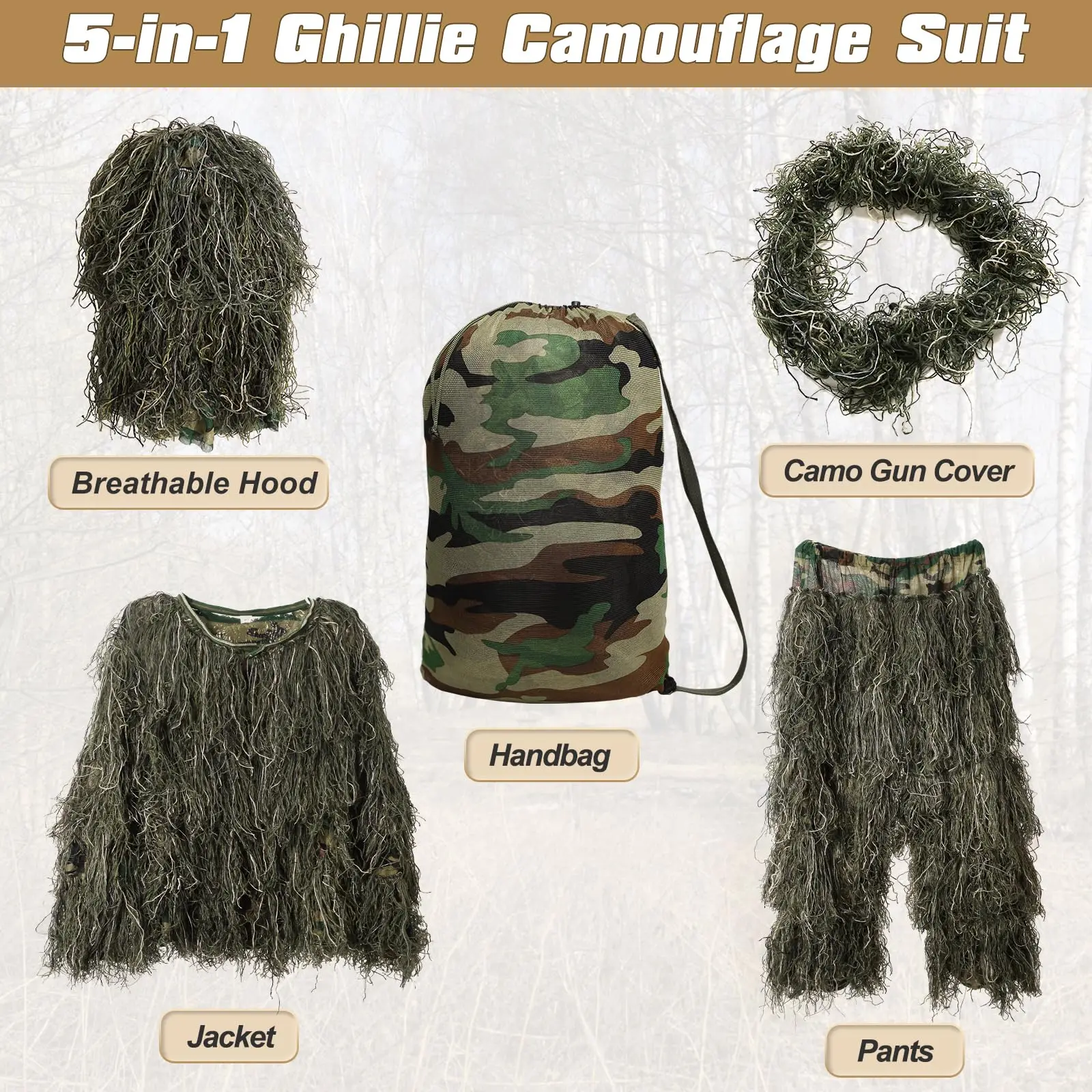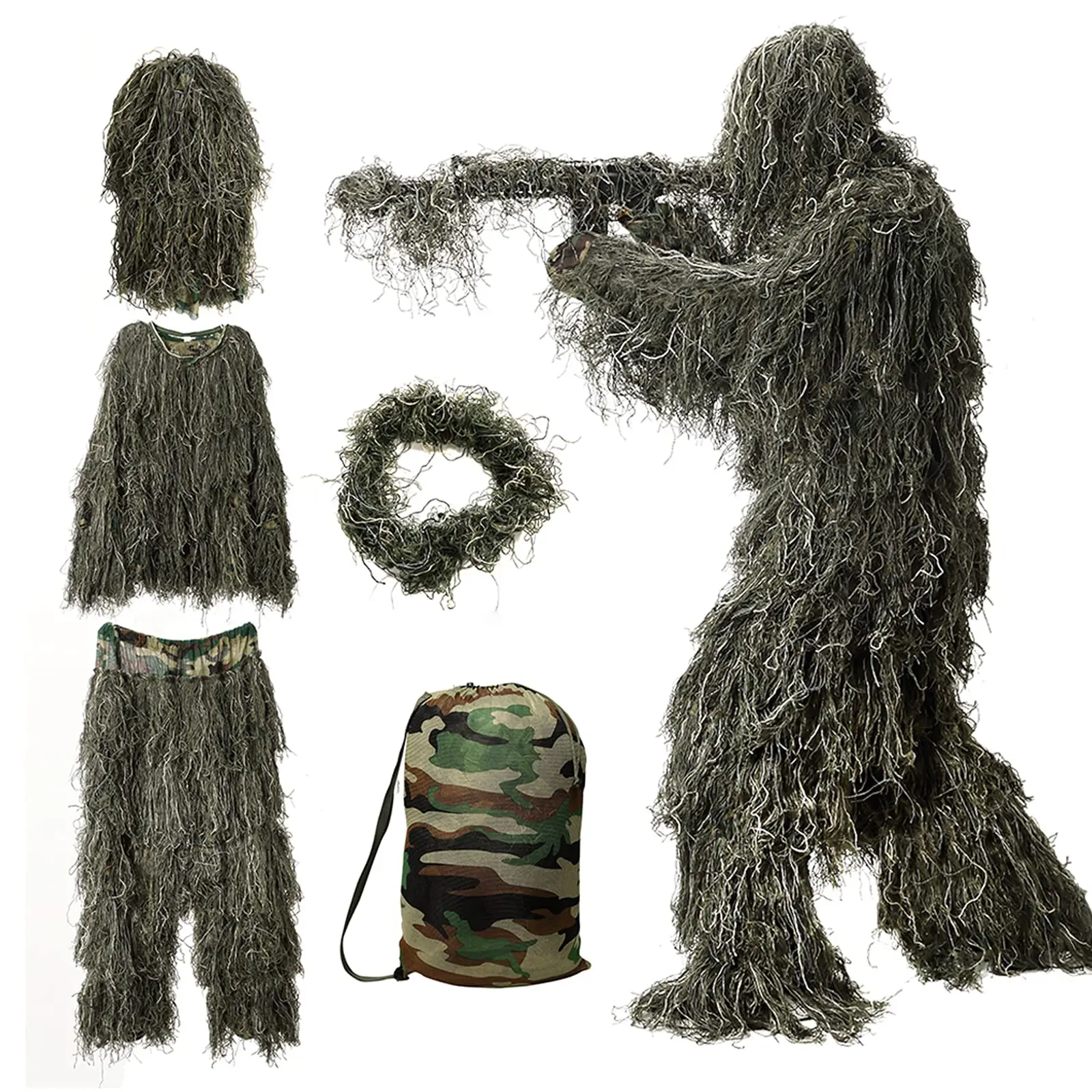 👍【Traje Ghillie 5 en 1】El traje Ghillie incluye: 1 chaqueta, 1 pantalón, 1 funda para pistola de camuflaje, 1 capucha separada, 1 bolsa de transporte.Nota: Debido a que el producto se comprimirá o arrugará después del embalaje, después de recibir la mercancía, es posible que deba ordenar primero los hilos exteriores para que puedan cubrir la superficie exterior de manera uniforme.