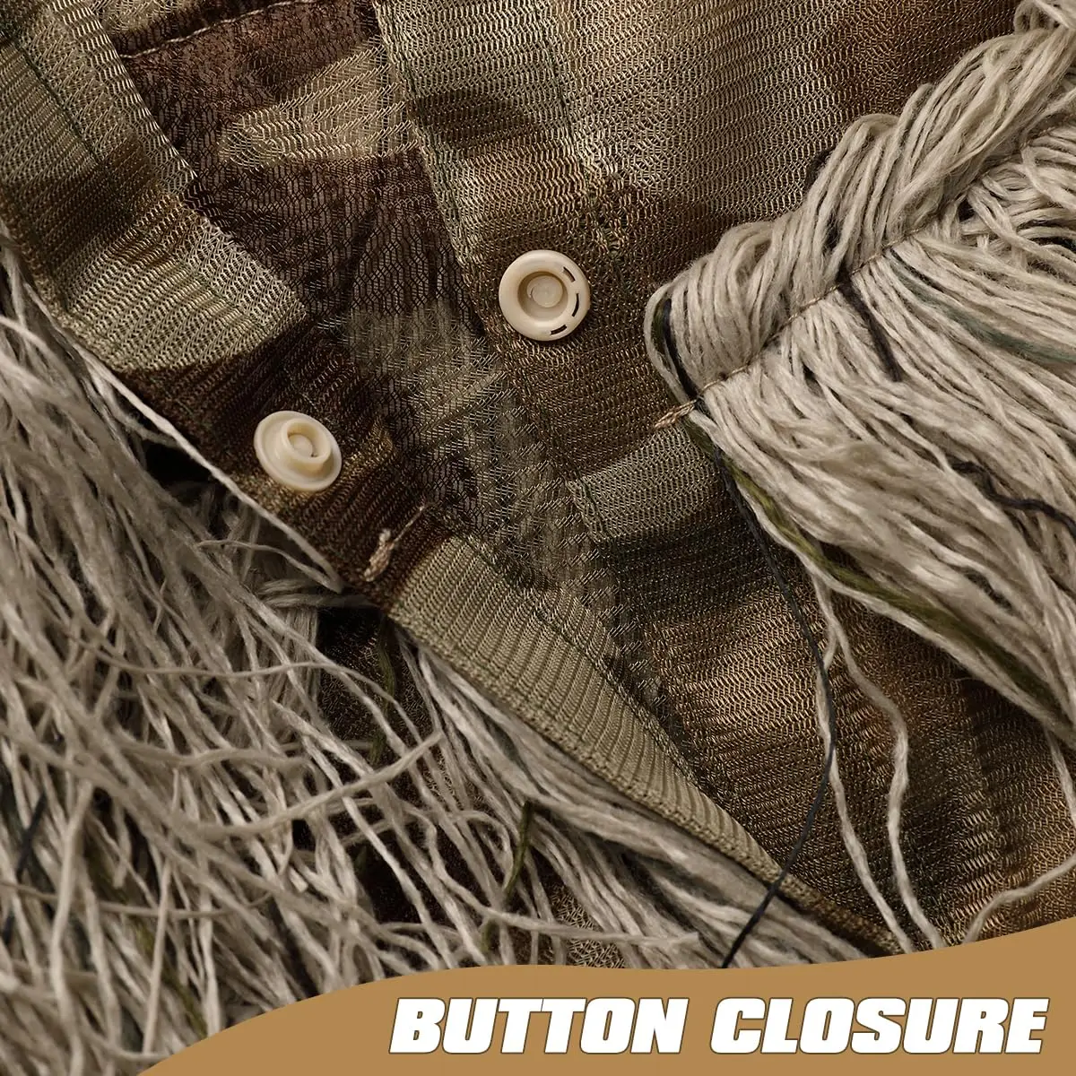 👍【Detalles de diseño humanizados】 Diseño de broche, fácil de usar y quitar, para que no tenga que preocuparse de que el hilo se atasque en la cremallera.Los puños y los tobillos elásticos hacen que el traje ghillie se ajuste mejor al cuerpo.El diseño elástico en la cintura le permite ajustar libremente la tensión.Diseño simple de cuello redondo, mano de obra fina, ajuste ceñido tridimensional, ¡estilo hermoso!