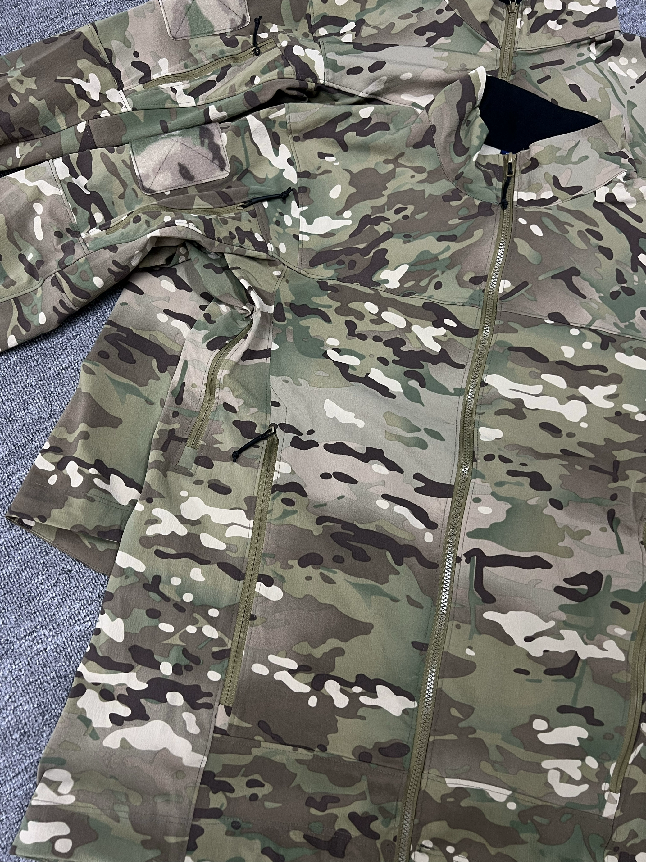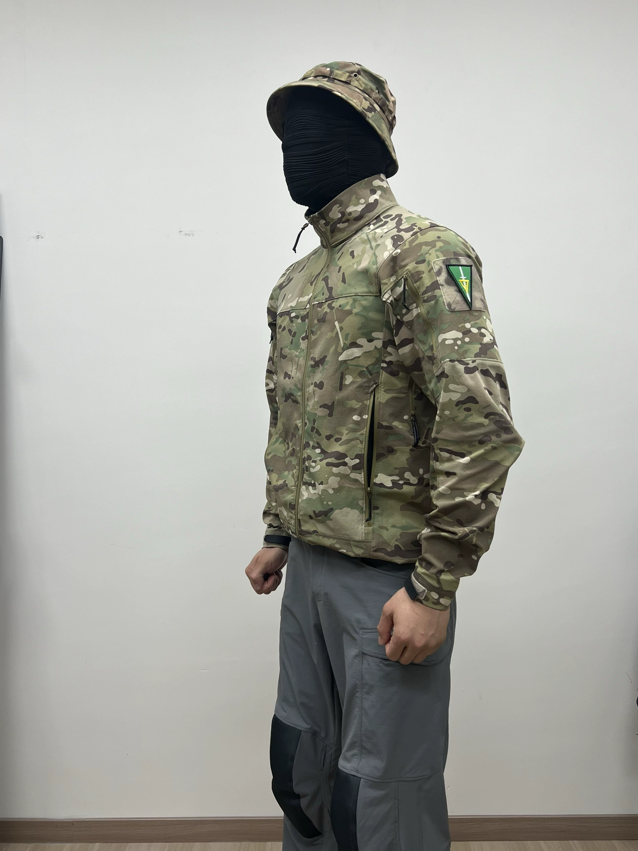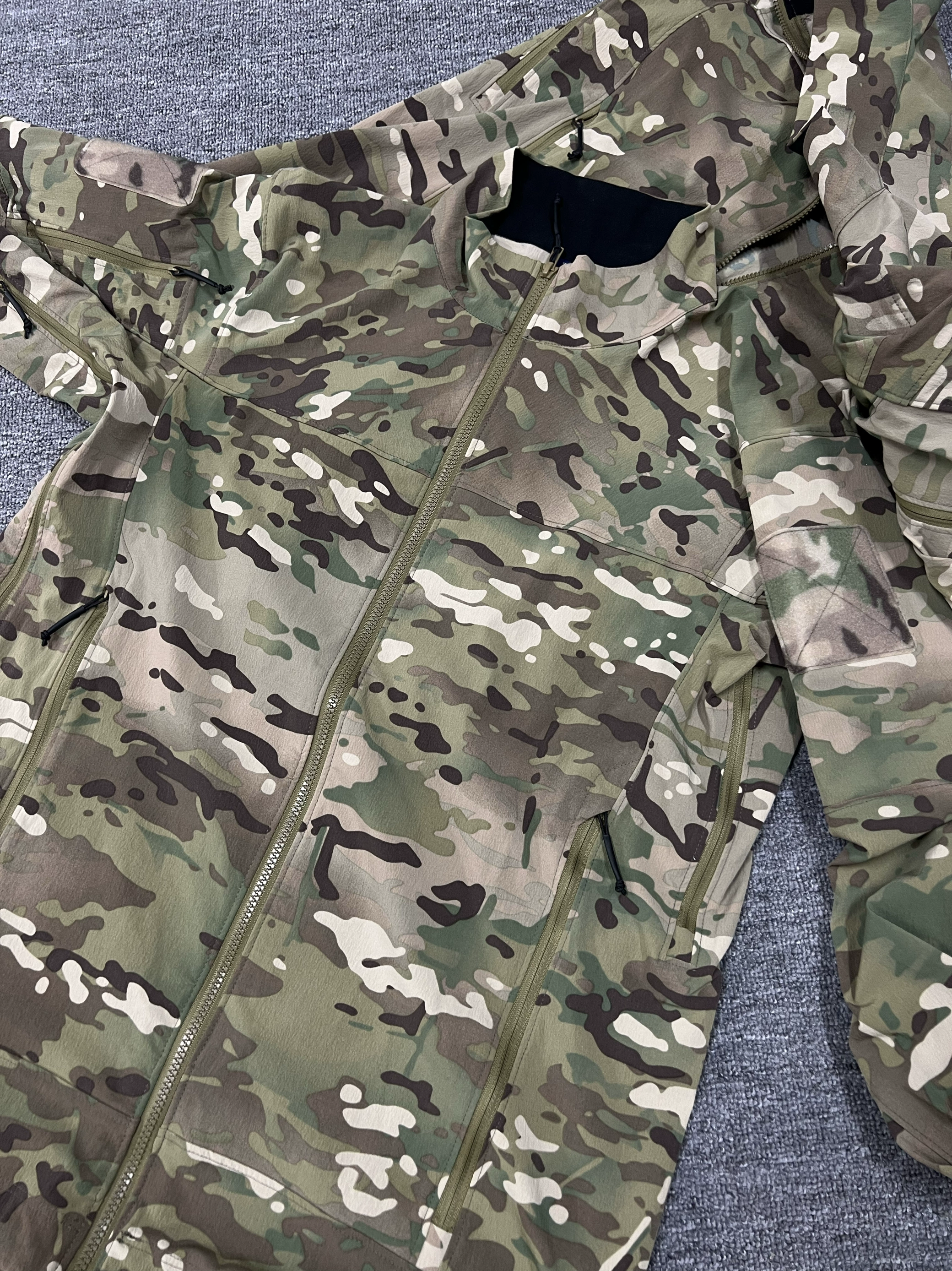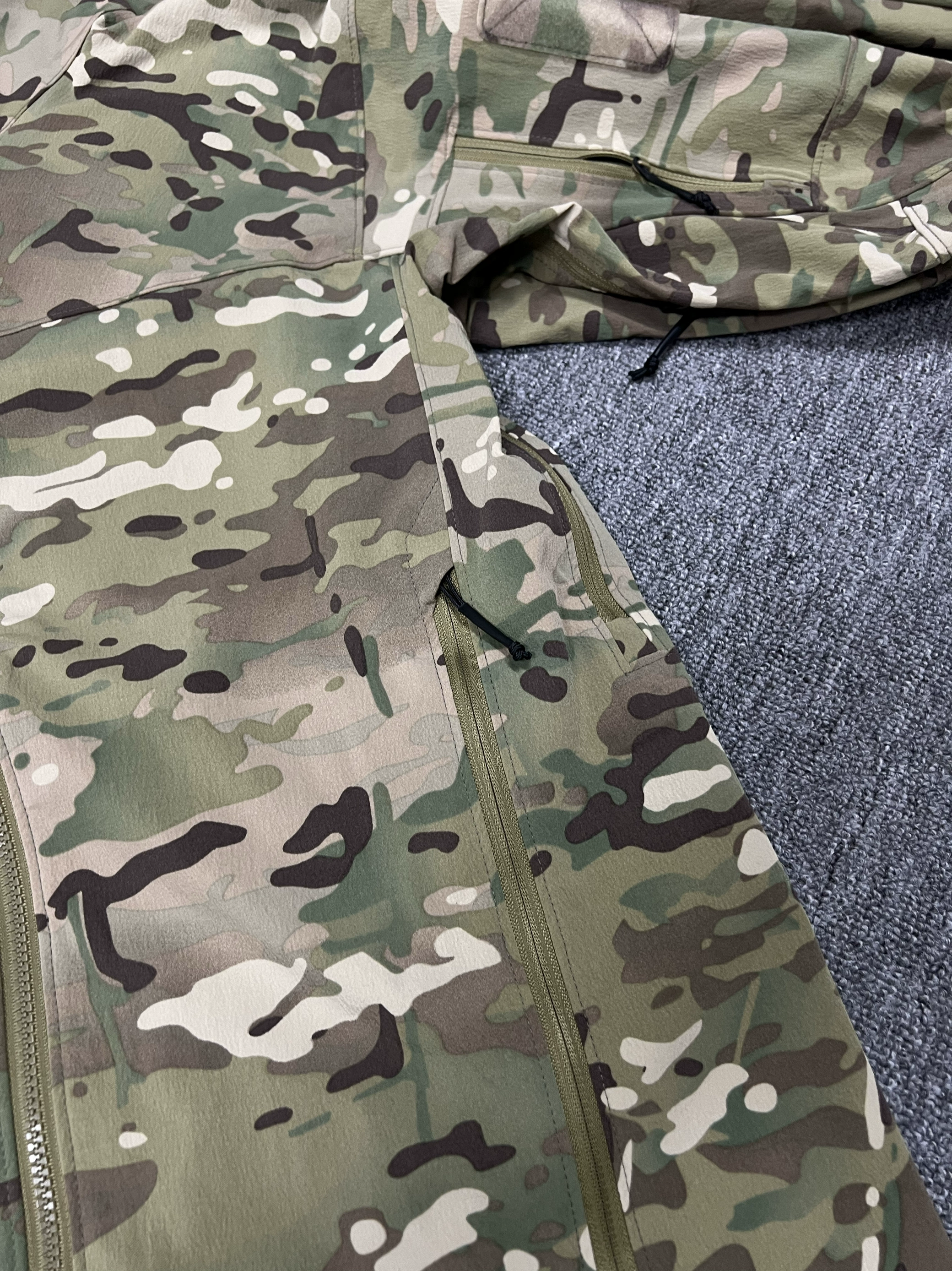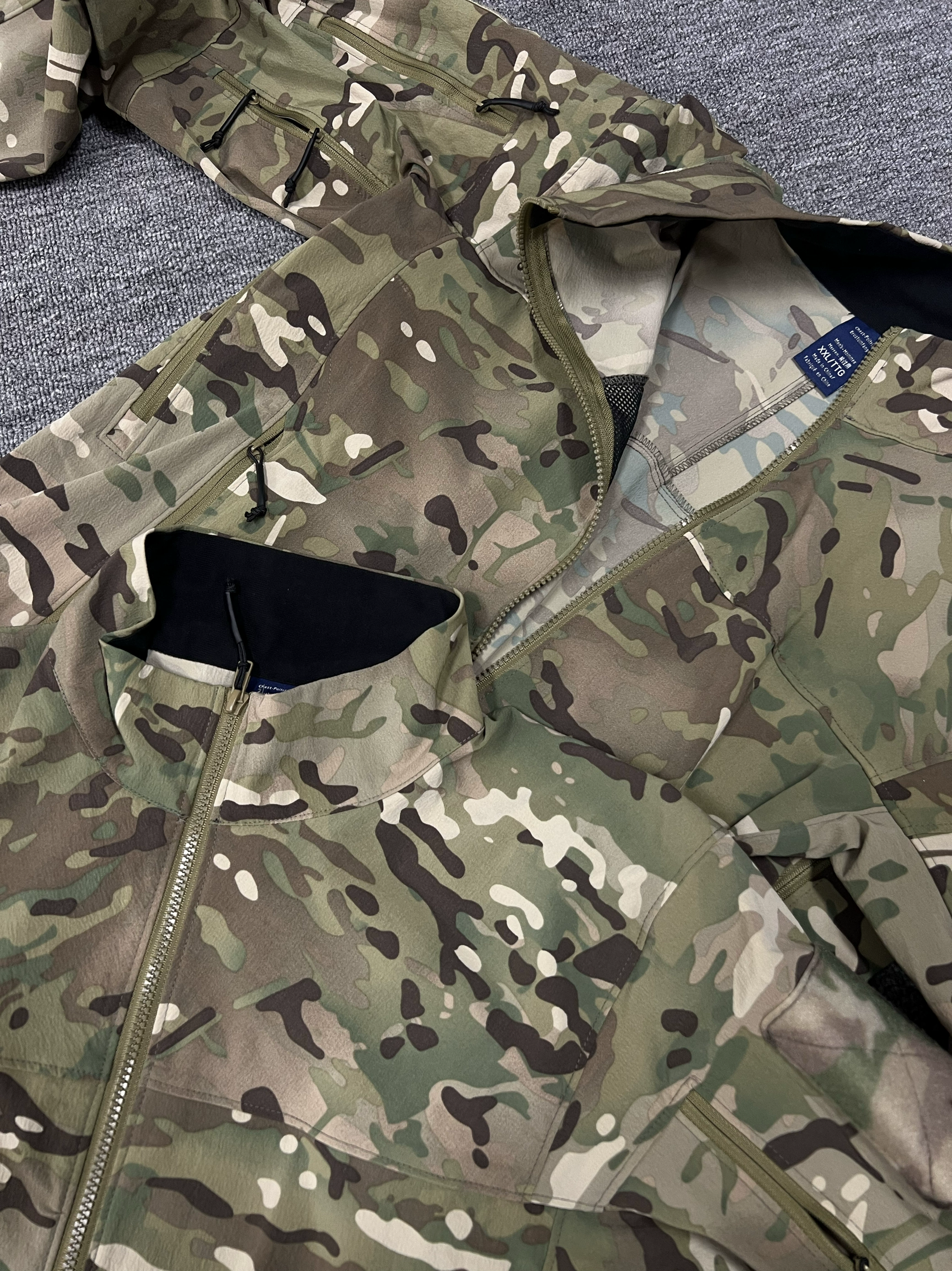 Traje táctico al aire libre con cáscara suave de cáscara de naranja, chaqueta elástica de tres pruebas para exteriores de cuatro lados