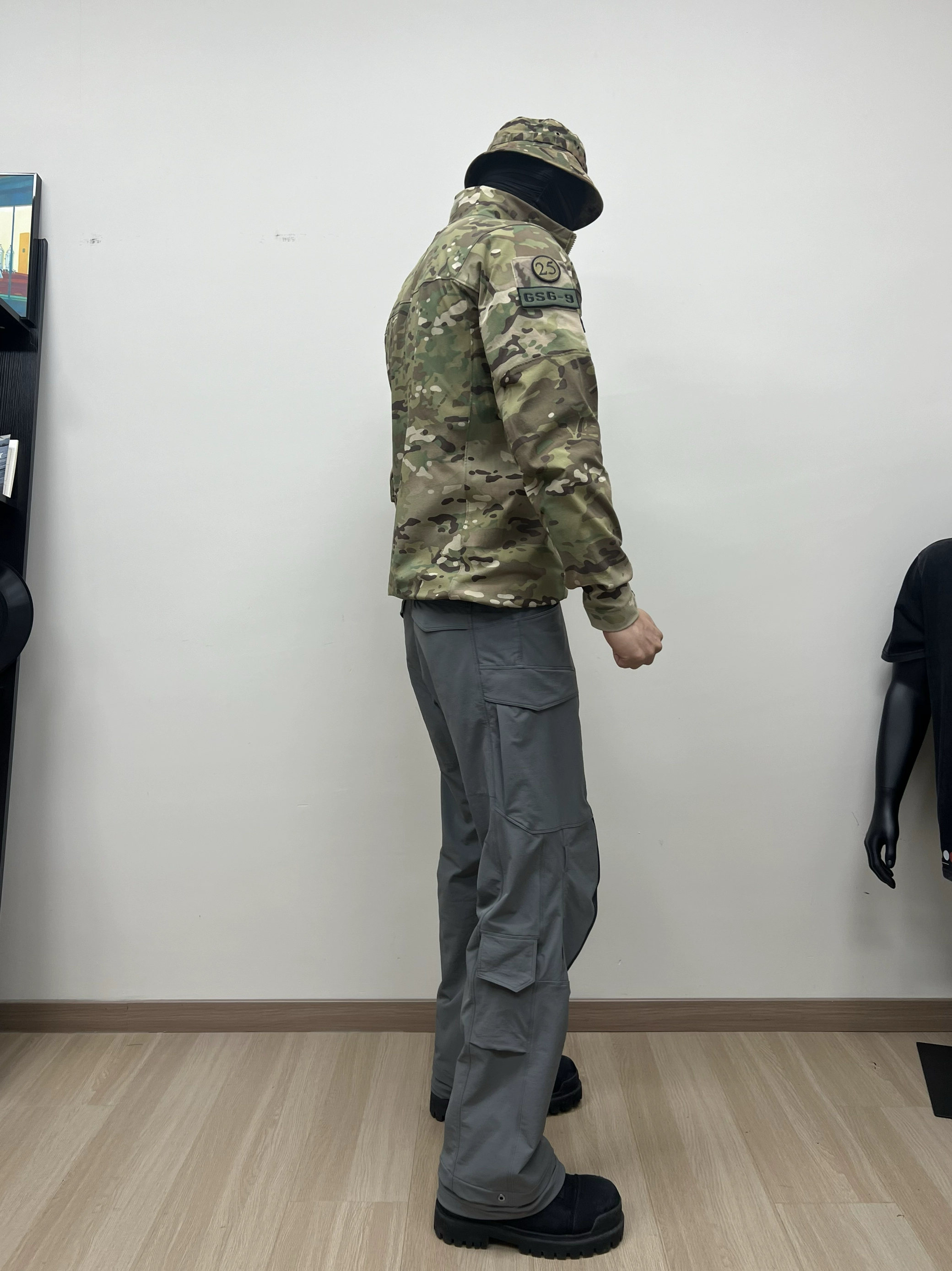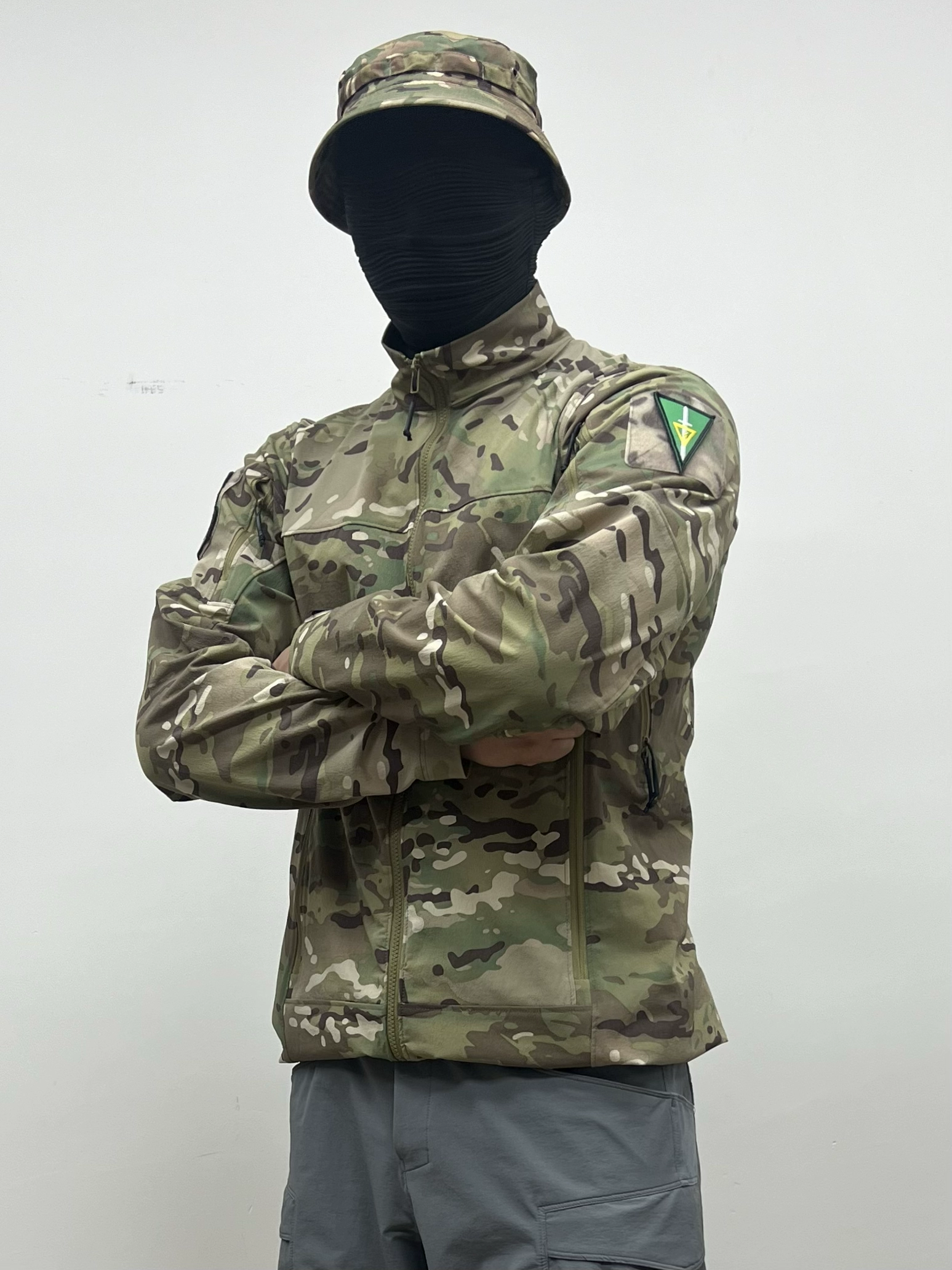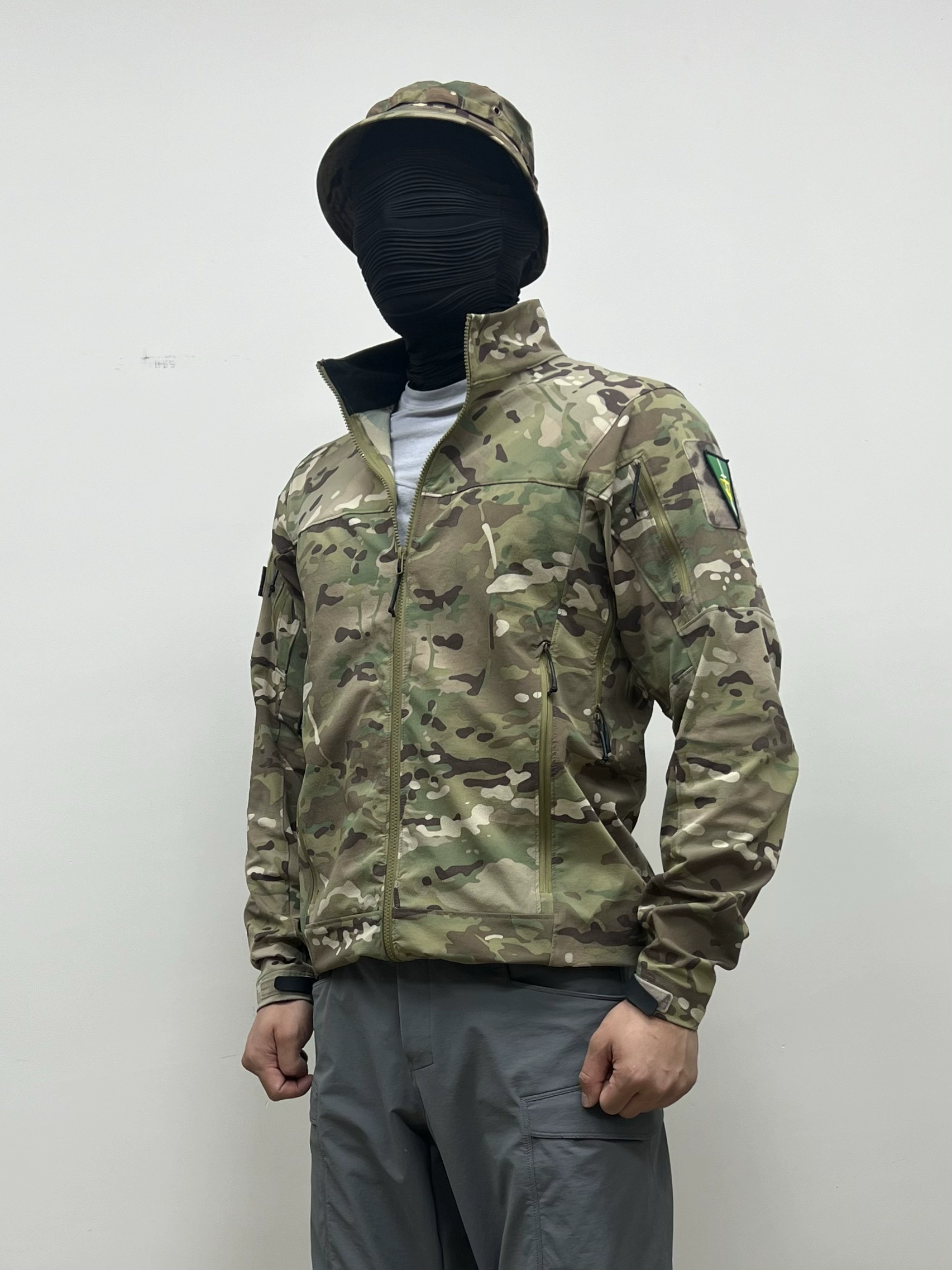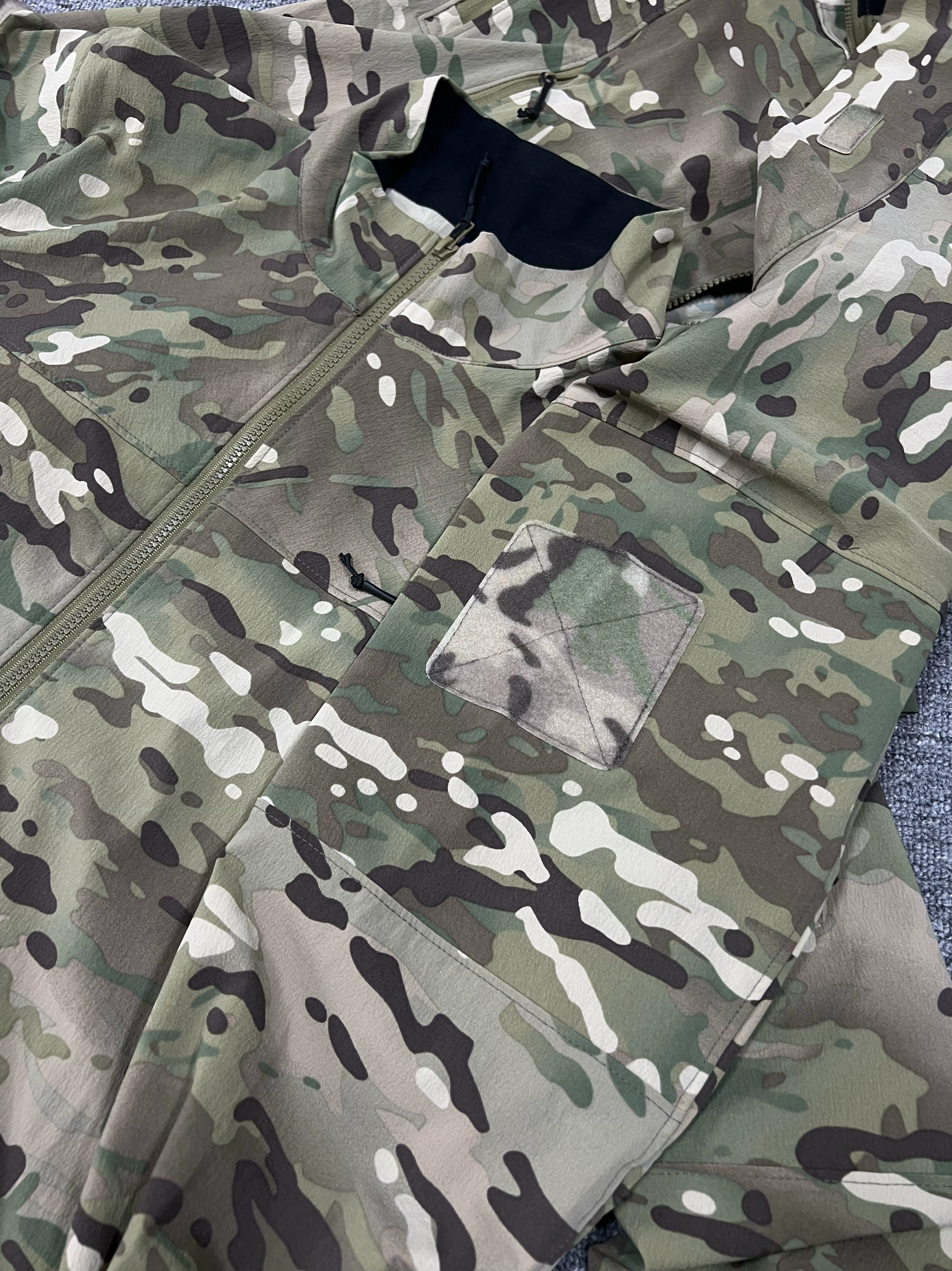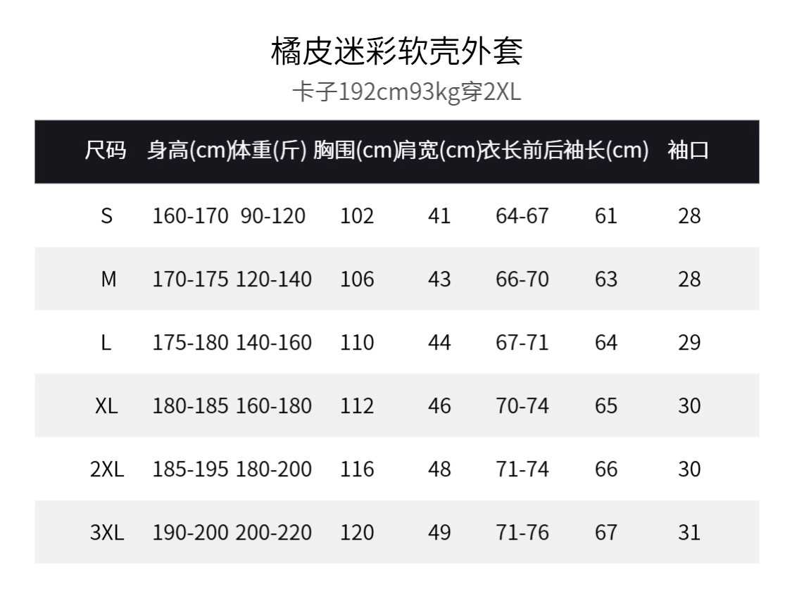 Traje táctico al aire libre con cáscara suave de cáscara de naranja, chaqueta elástica de tres pruebas para exteriores de cuatro lados