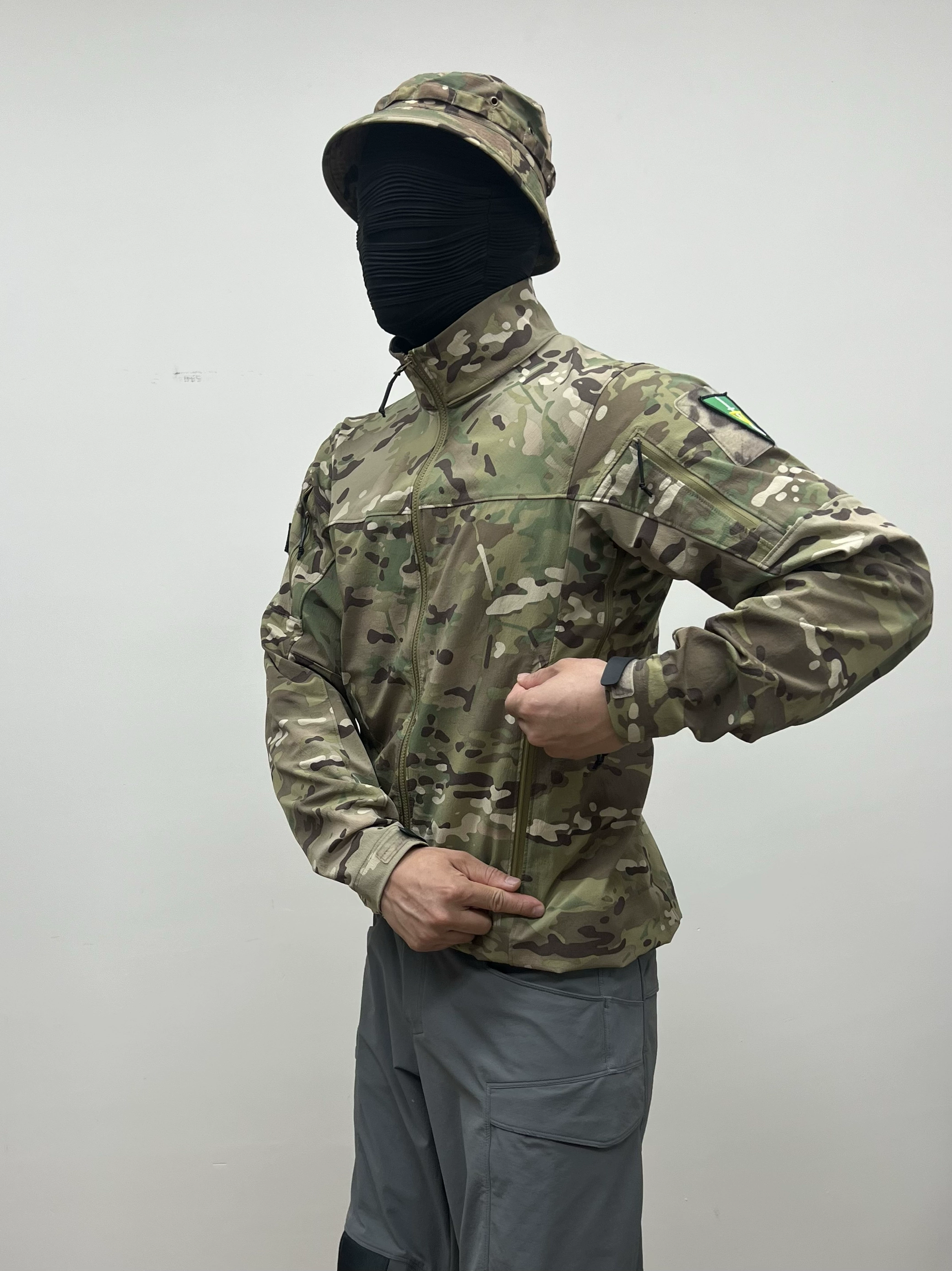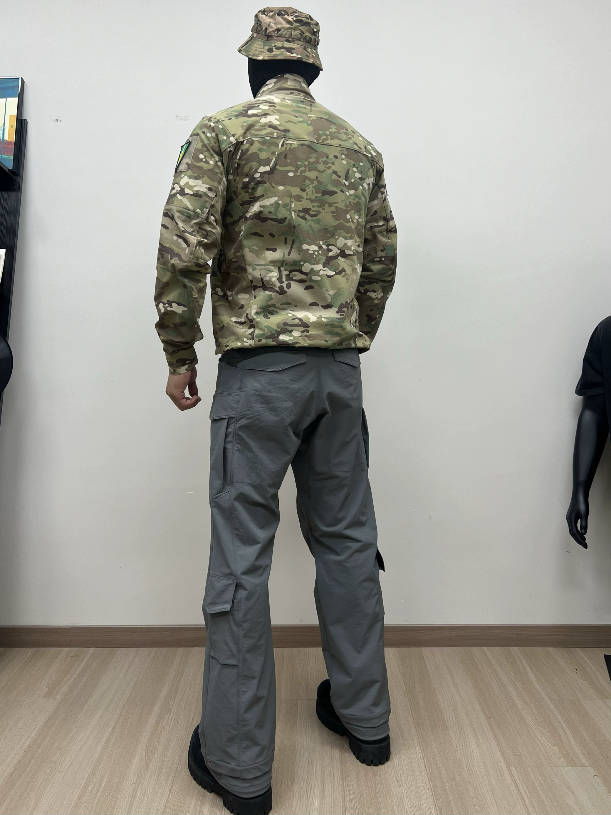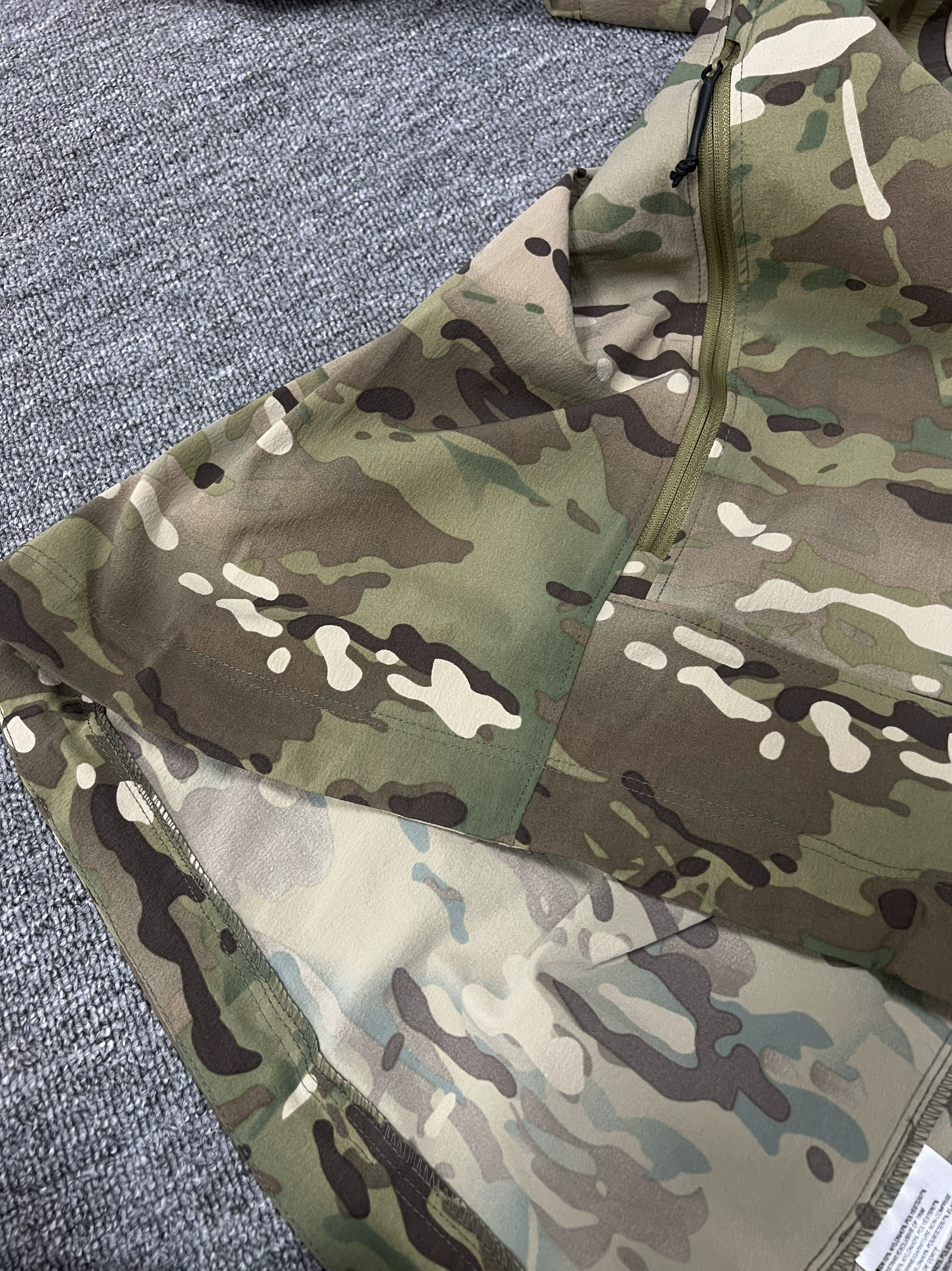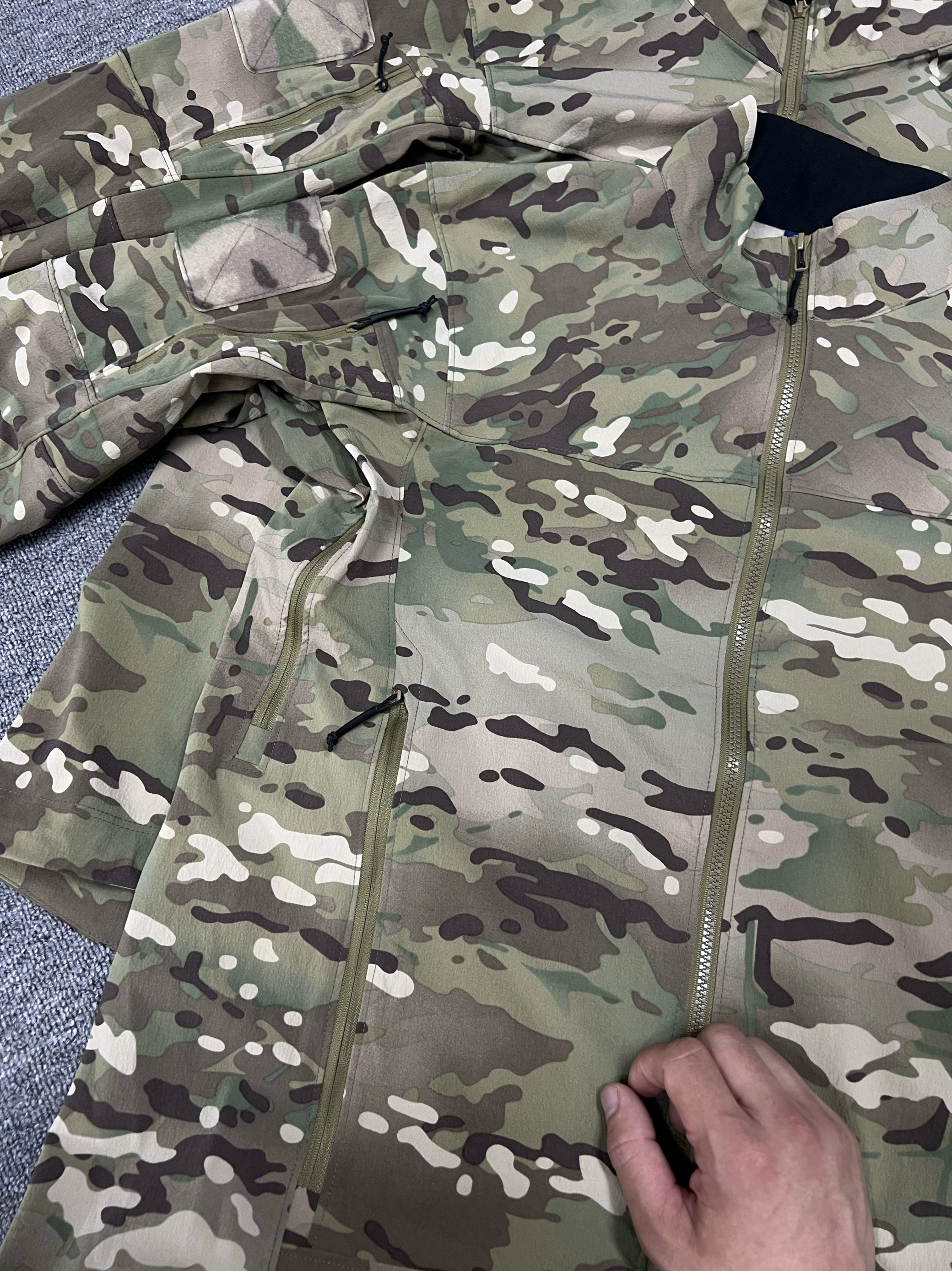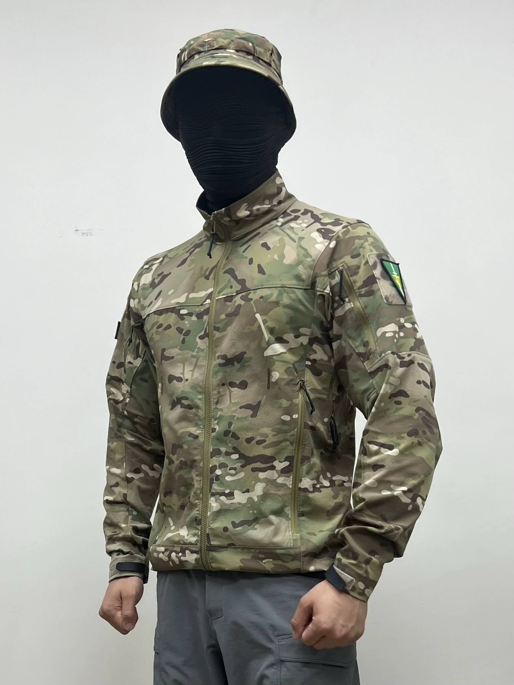 Traje táctico al aire libre con cáscara suave de cáscara de naranja, chaqueta elástica de tres pruebas para exteriores de cuatro lados