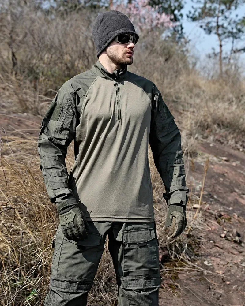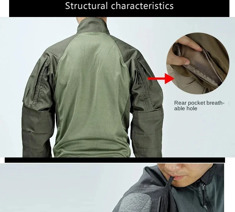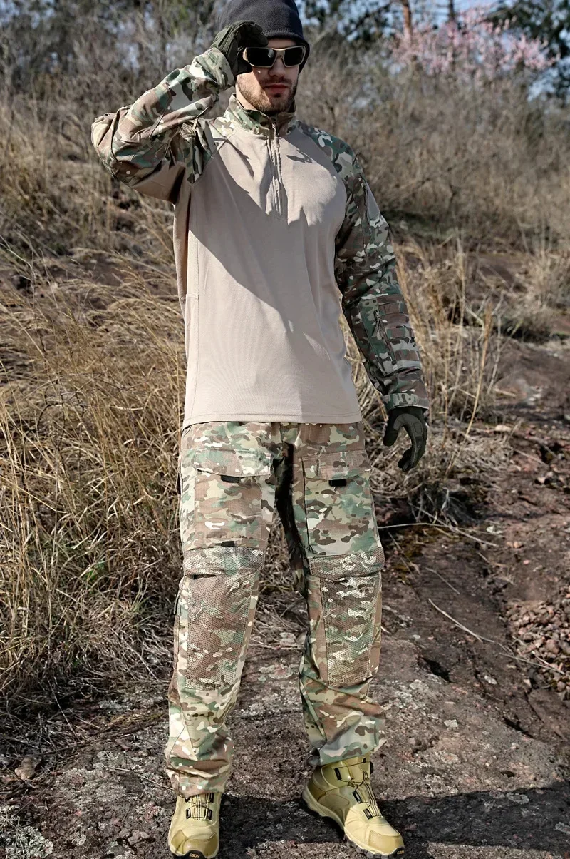 Trajes tácticos Milit Outdoor Camo uniforme de combate camisas de caza pantalones traje de entrenamiento de pesca Airsoft Paintball conjuntos de ropa 2026 Material: Tejido de punto sólido: 95% poliéster + 5% elastano Tejido de camuflaje: 65% poliéster + 35% algodón