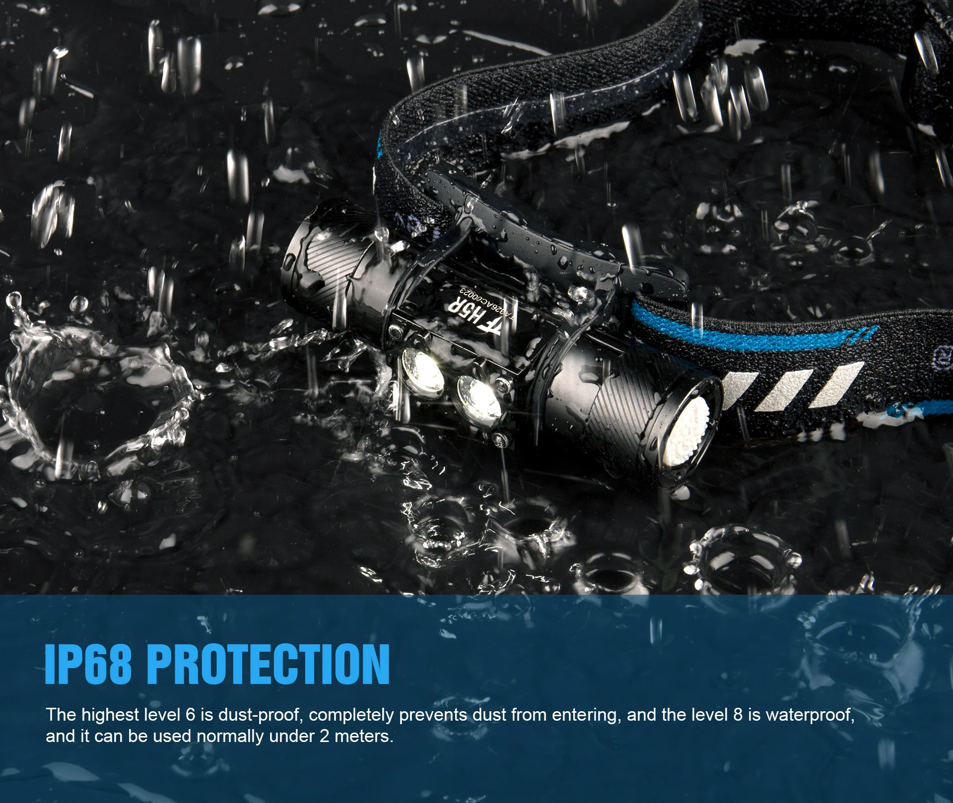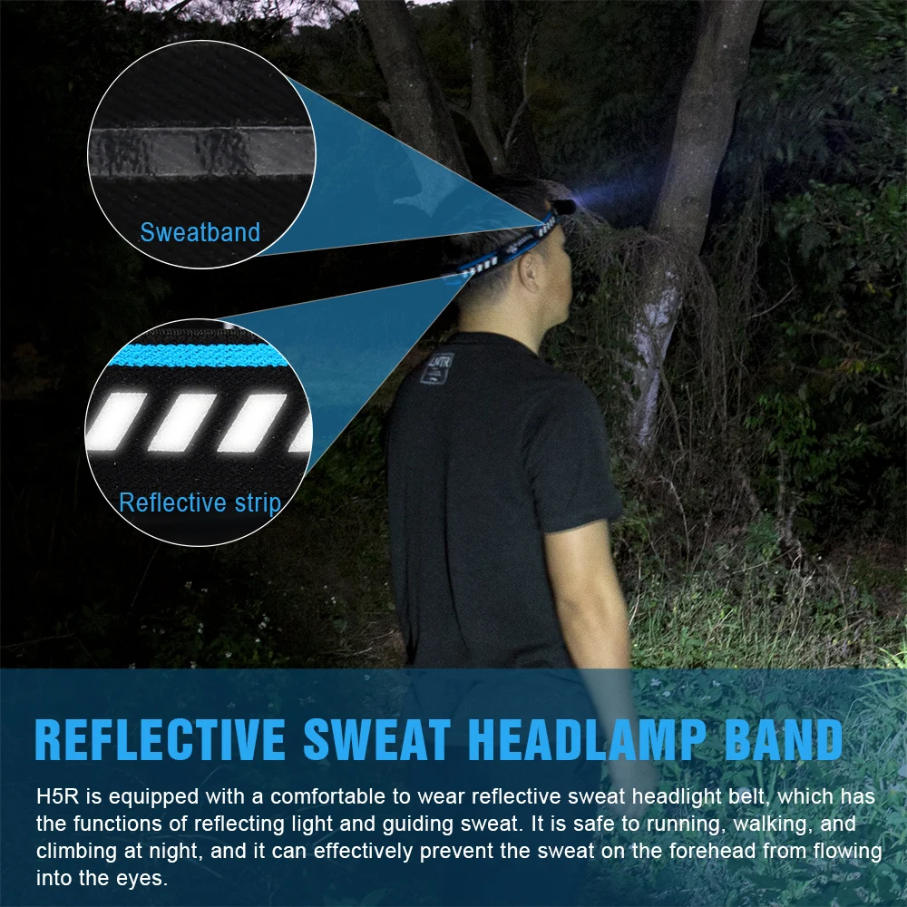 H5R está equipado con un cómodo cinturón reflectante para el sudor, que tiene las funciones de reflejar la luz y guiar el sudor. Es seguro para correr, caminar y escalar por la noche, y puede evitar eficazmente que el sudor en la frente fluya hacia los ojos.