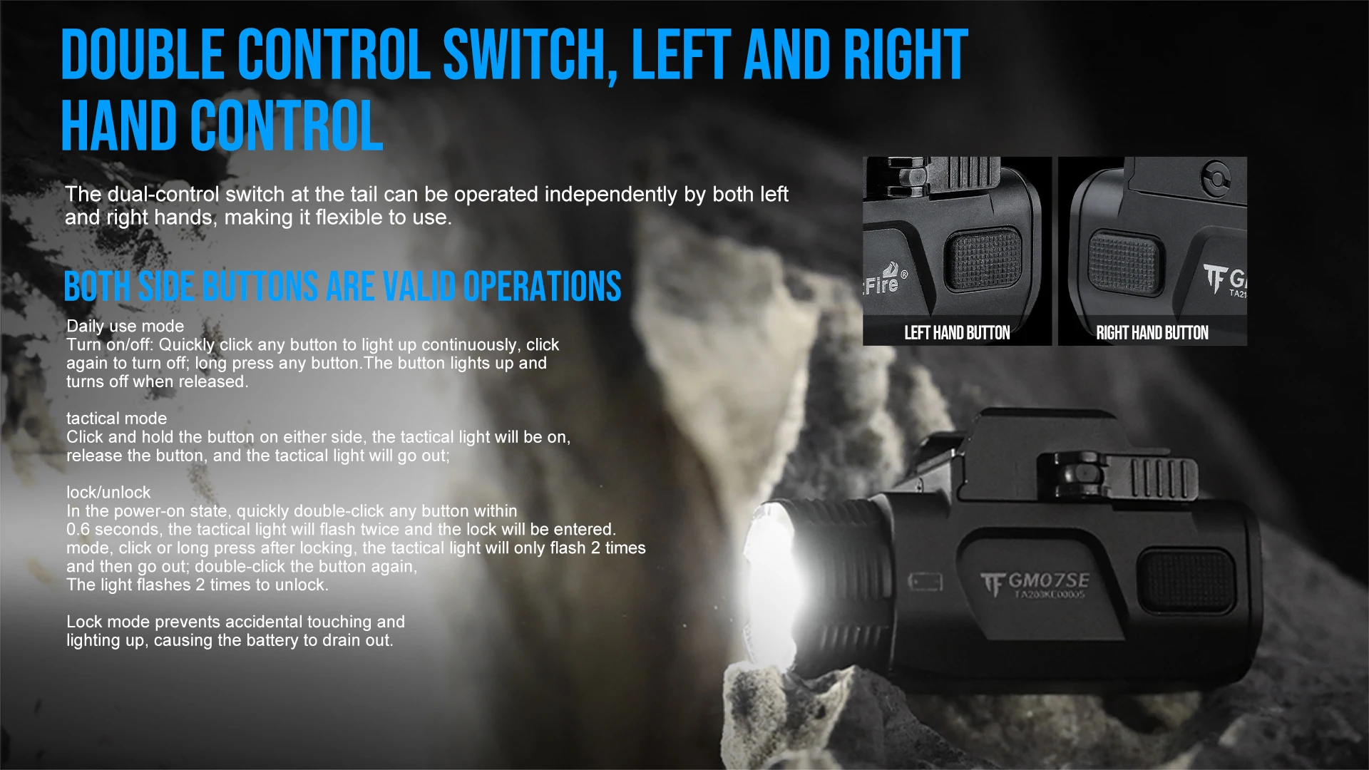 tactical modeClick and hold the button on either side. the tactical light will be on.release the button, and the tactical light will go out;