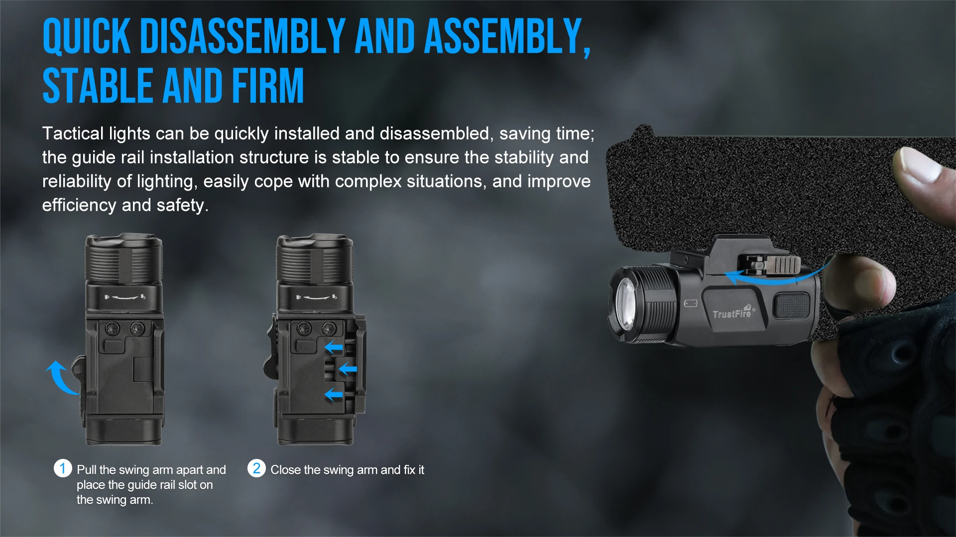 Tactical lights can be quickly installed and disassembled, saving time:the guide rail installation structure is stable to ensure the stability andreliability of lighting, easily cope with complex situations, and improveefficiency and safety.