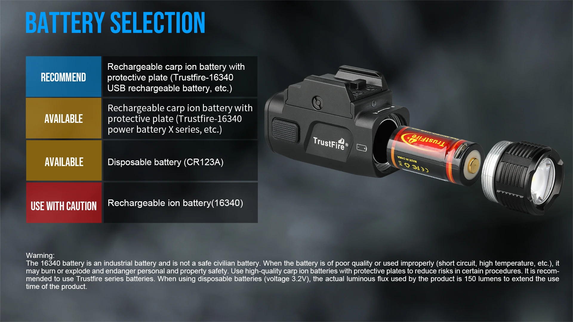 RECOMMEND: Rechargeable carp ion battery withprotective plate (Trustfire-16340USB rechargeable battery, etc.)