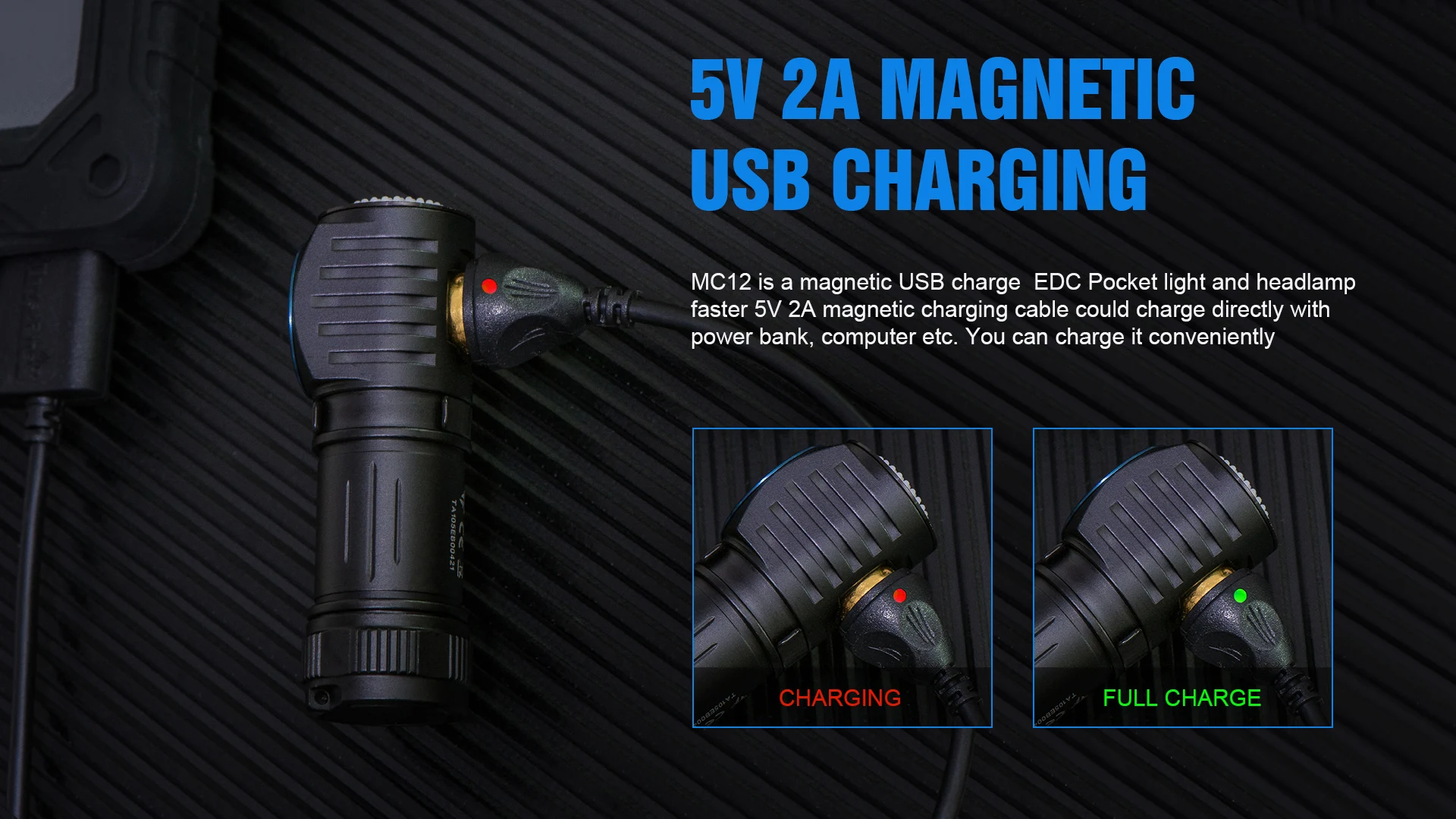 MC12 es una linterna y faro EDC de carga USB magnética perfecta para doble uso, construcción de circuito inteligente en el interior, corriente constante, brillo constante. Con un cable de carga magnética de 5V 2A más rápido y podría cargar directamente con el Banco de energía, computadora, etc. puede cargarlo cómodamente.