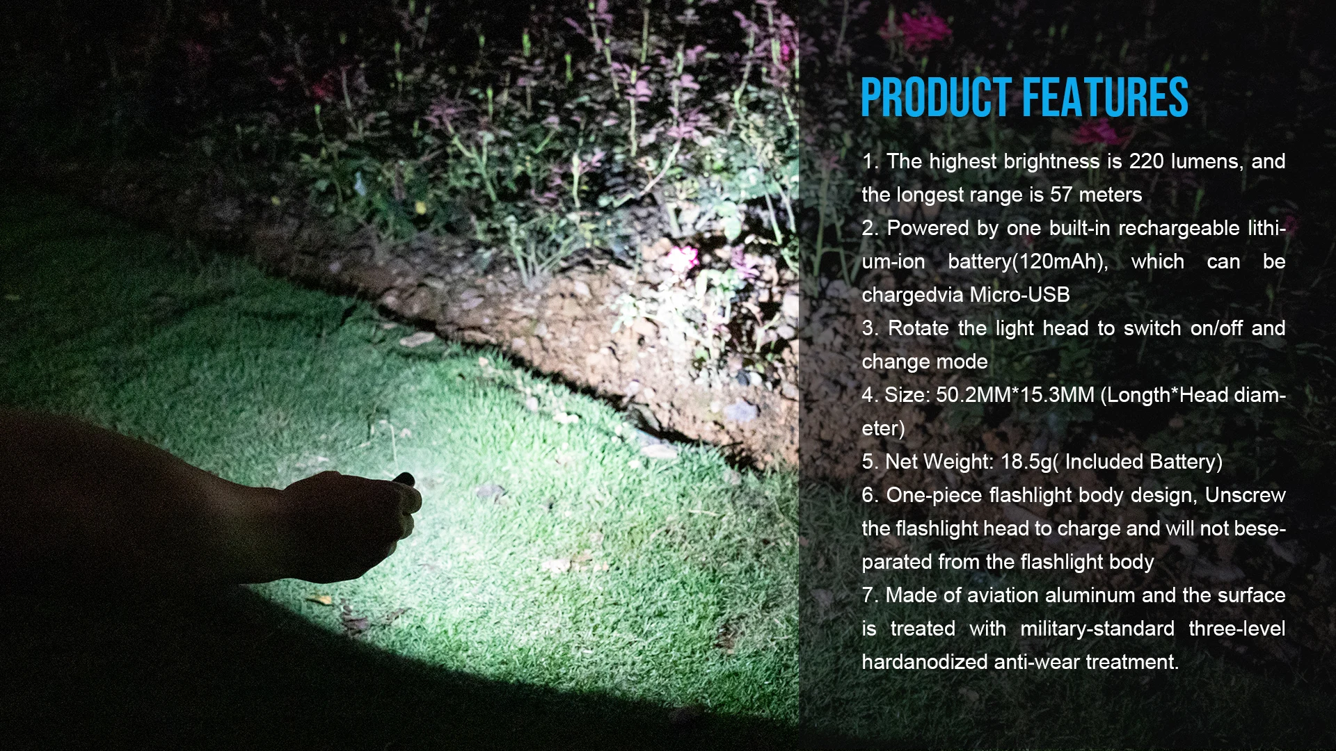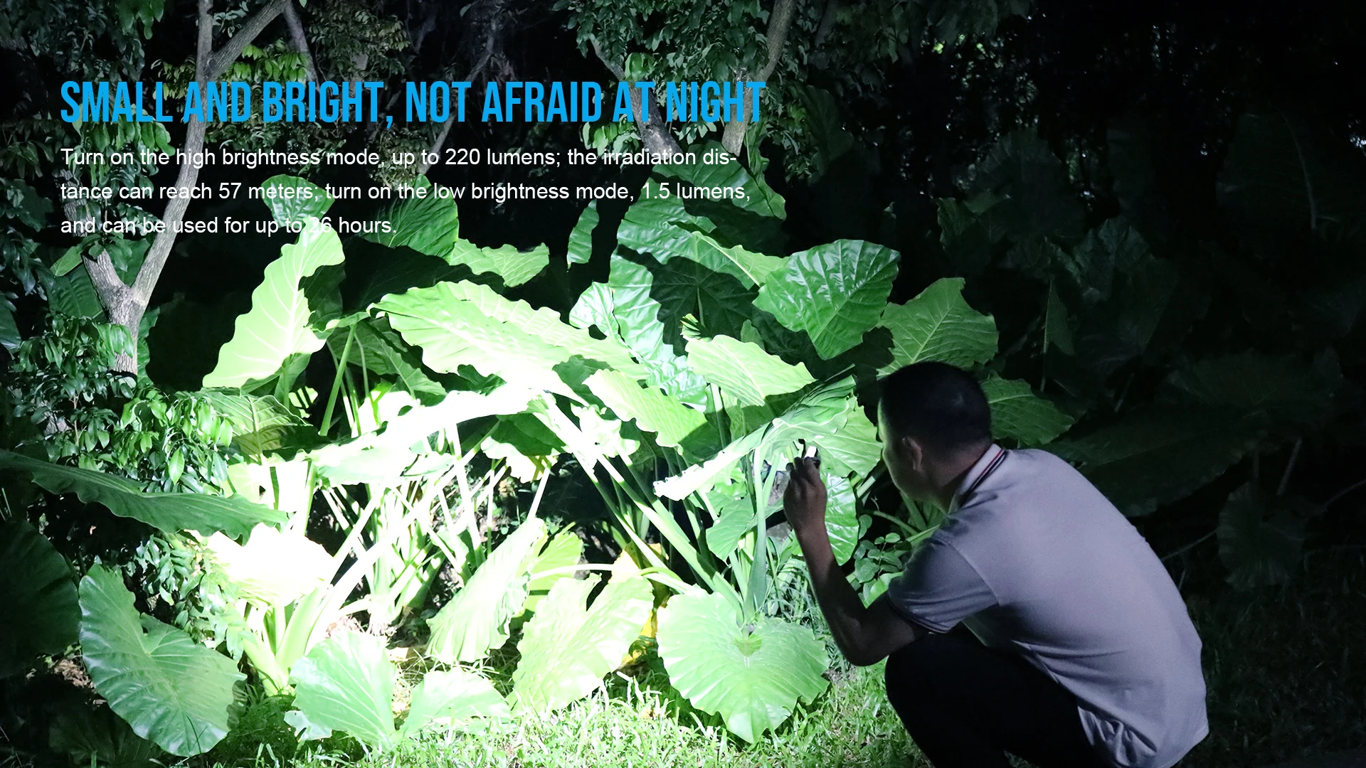 Active el modo de brillo alto, hasta 220 lúmenes; la distancia de irradiación puede alcanzar 57 metros; active el modo de bajo brillo, 1,5 lúmenes y se puede utilizar hasta 26 horas