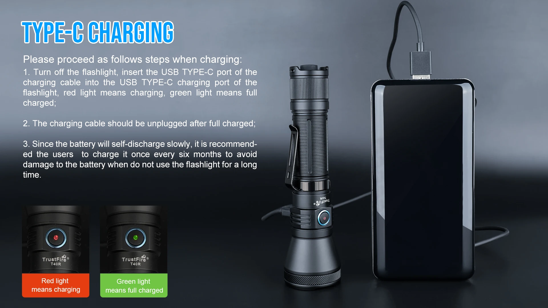 1.Apague la linterna, inserte el puerto USB TYPE-C del cable de carga en el puerto de carga USB TYPE-C de la linterna, la luz roja significa cargar, la luz verde significa cargarse completamente;