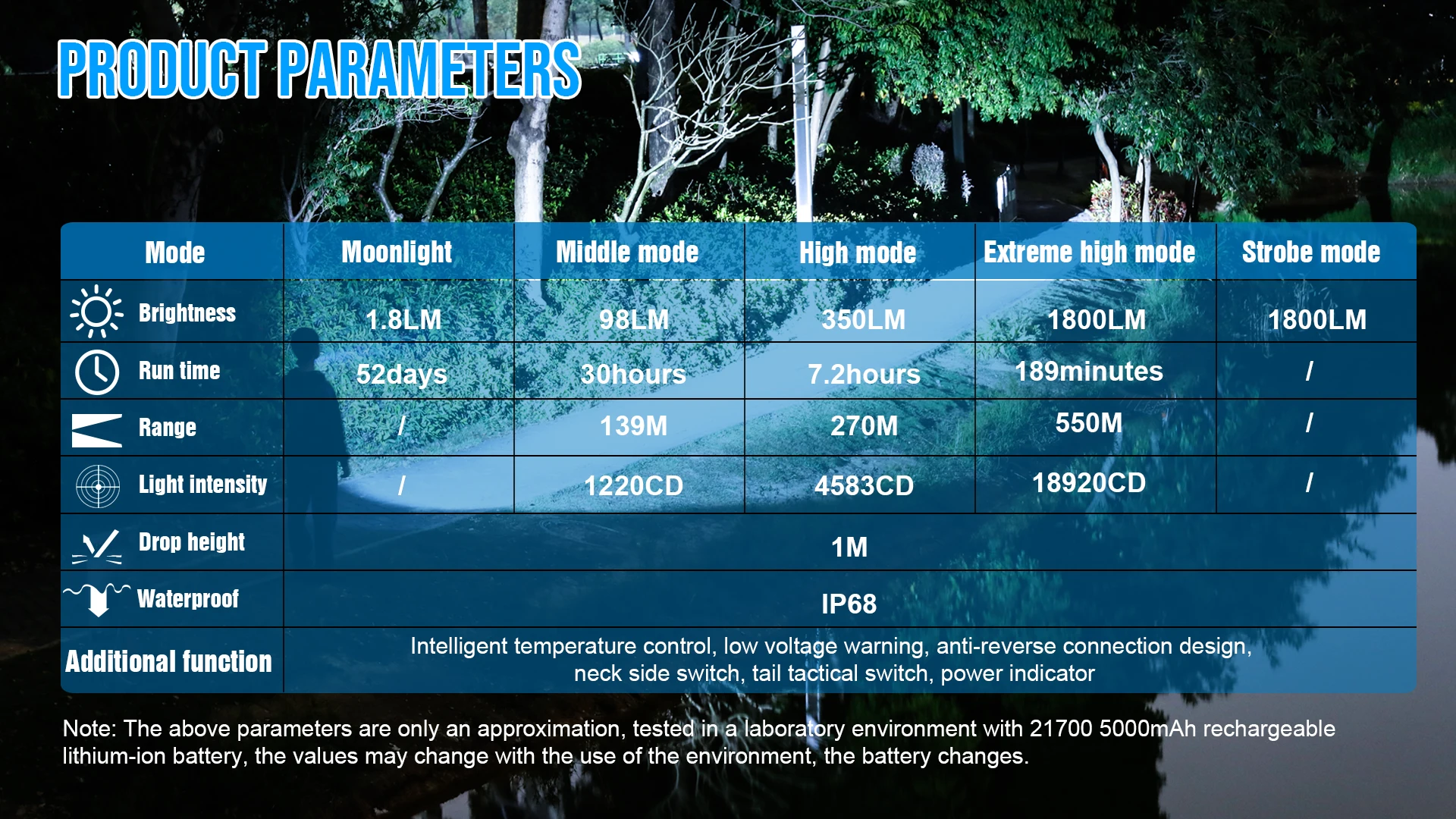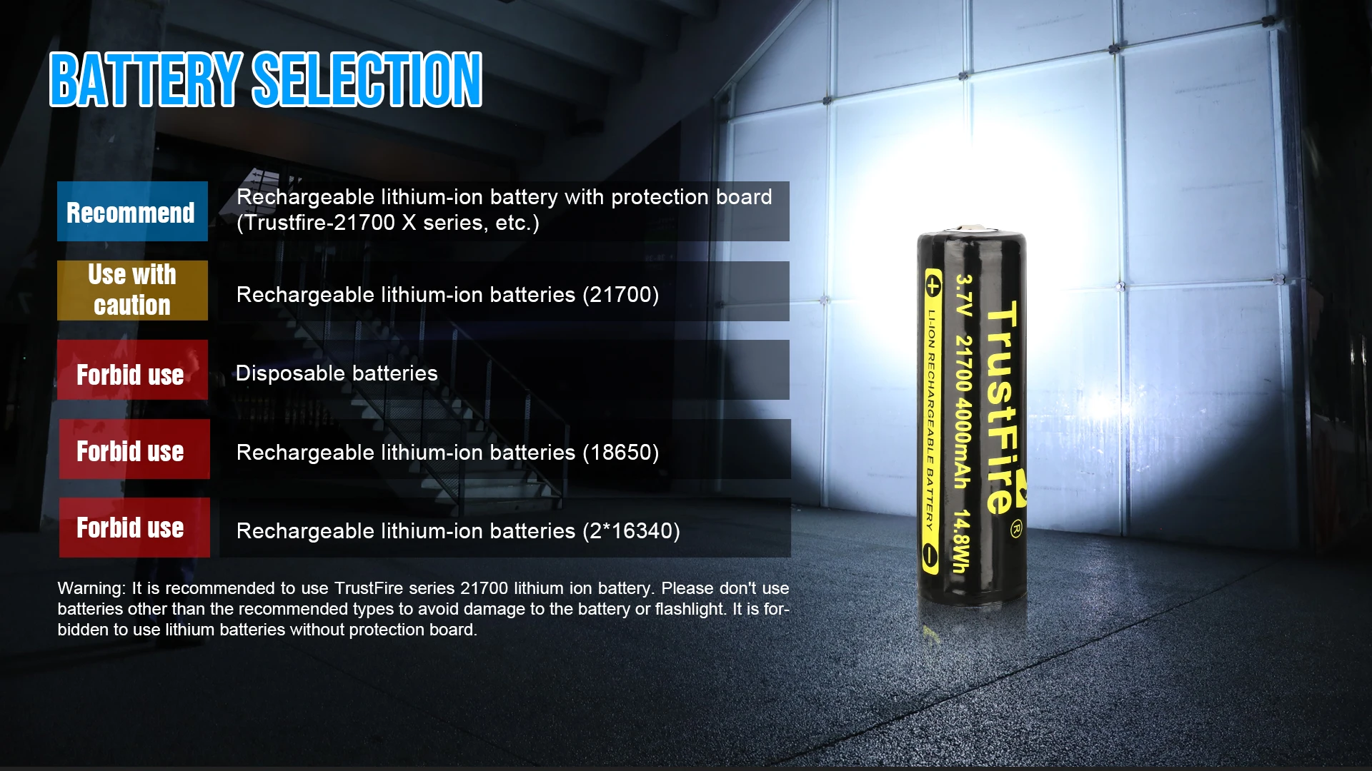 Advertencia: Se recomienda utilizar la batería de iones de litio TrustFire serie 21700. No utilice baterías distintas a los tipos recomendados para evitar daños a la batería o la linterna. Está prohibido utilizar baterías de lithlum sin tablero de protección.