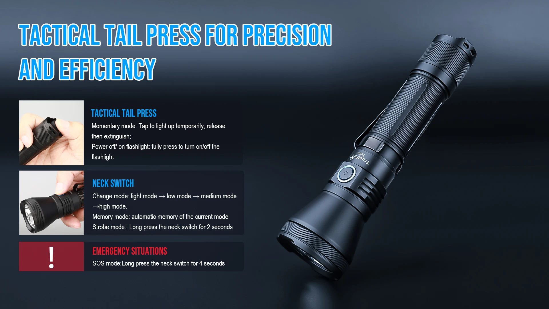 El diámetro del cuerpo de la linterna es de solo 26 mm, que puede adaptarse a la mayoría de los soportes de linterna táctica del mercado, el cuerpo de la linterna es compacto y fácil de acción.