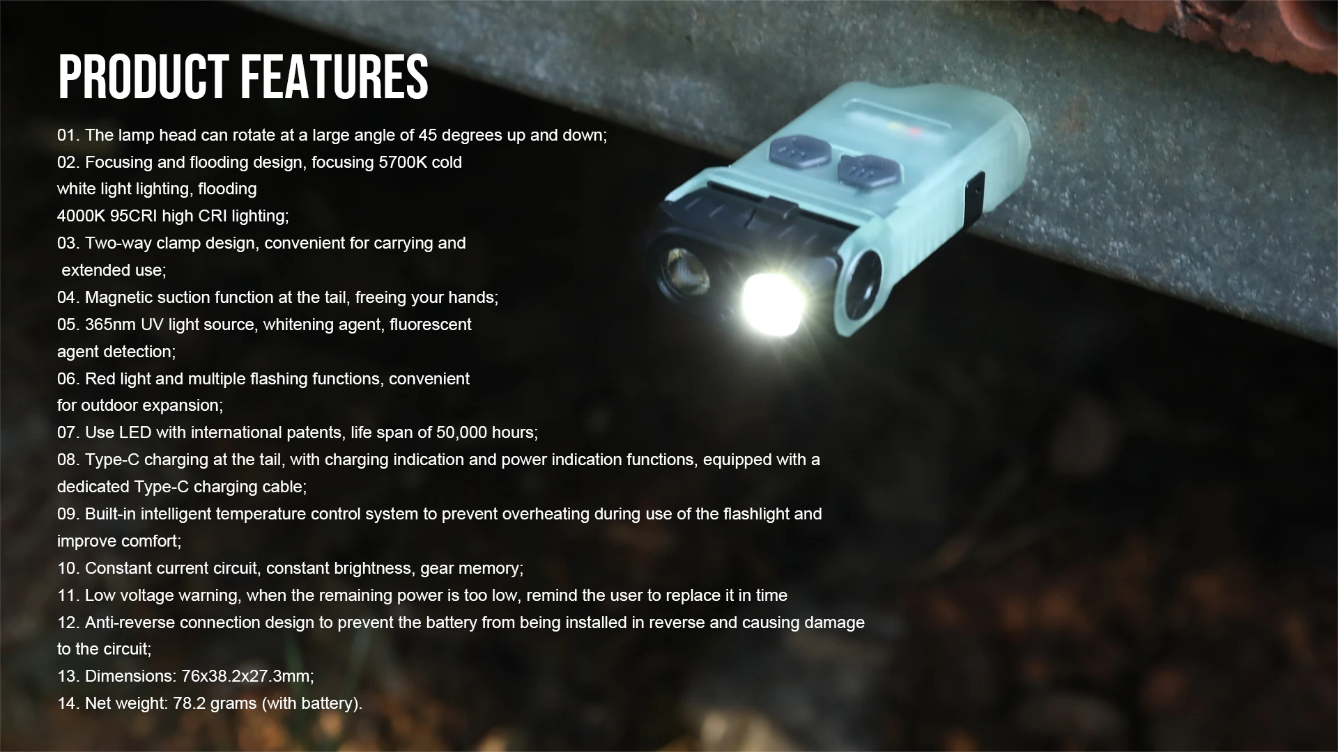 Tamaño pequeño, mini y exquisito, diseño ergonómico, agarre cómodo, teniendo en cuenta tanto el rendimiento como la practicidad;el cabezal de la lámpara está hecho de aluminio de aviación 6061, oxidación de tres niveles y el cuerpo de la lámpara está hecho de plásticos de ingeniería procesados con precisión CNC.Los detalles externos y la estructura interna están reforzados, lo que es efectivamente resistente a golpes, corrosión y rápida disipación del calor.