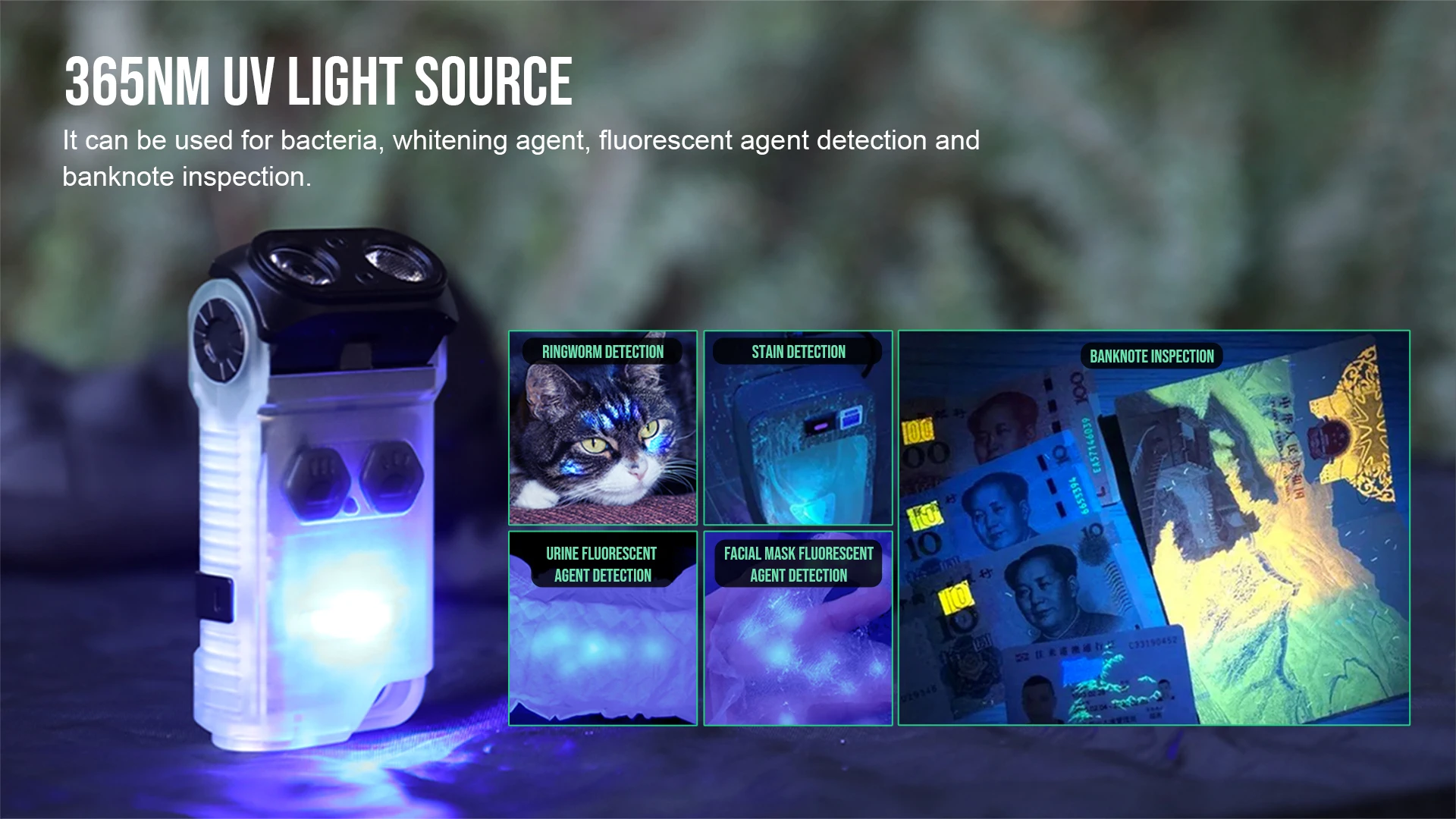 Se puede utilizar para bacterias, agentes blanqueadores, detección de agentes fluorescentes e inspección de billetes.