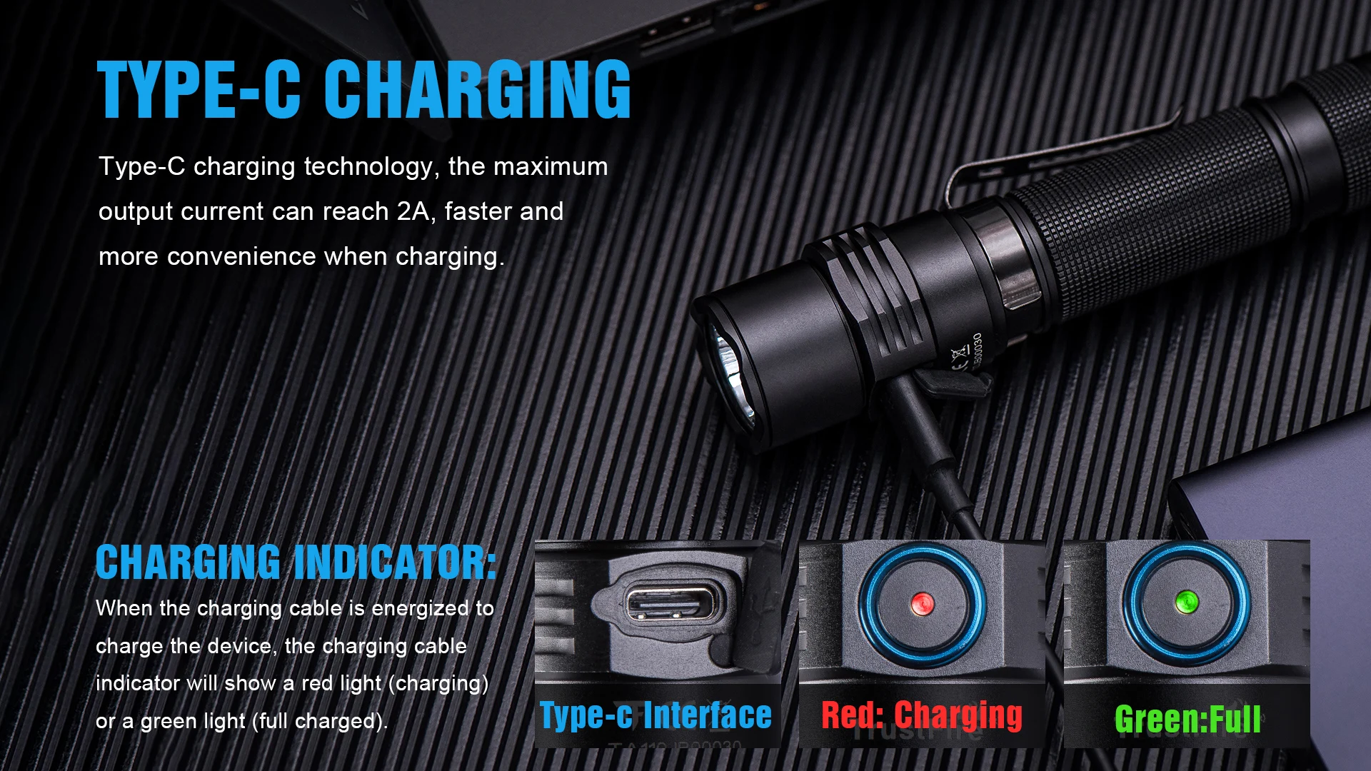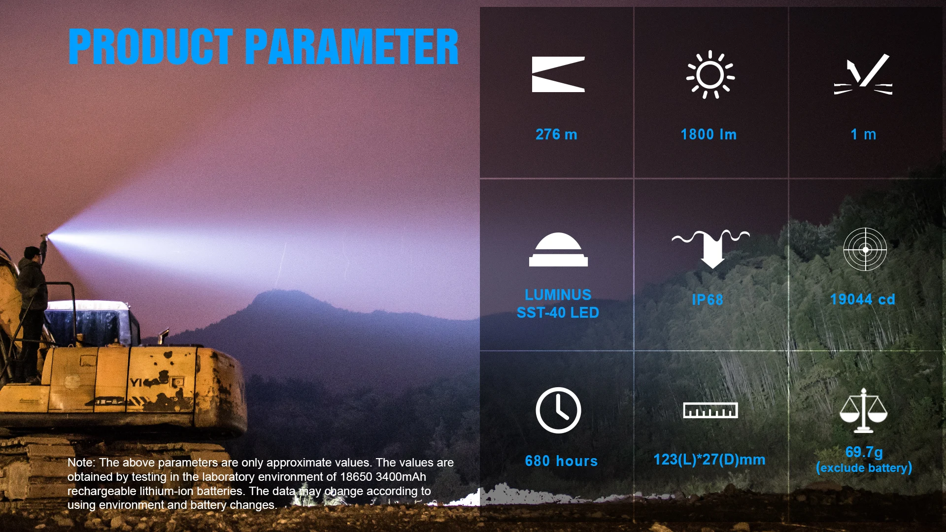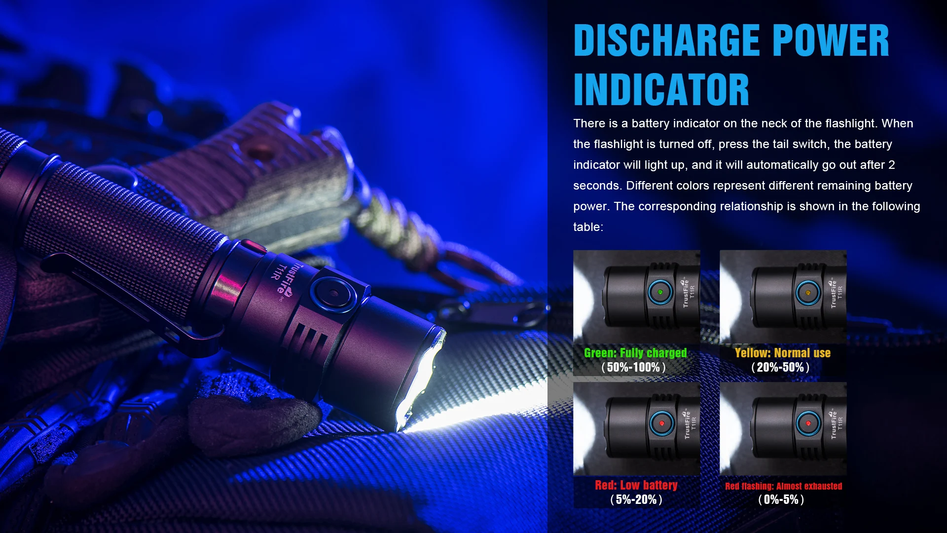 T11R tiene una fiabilidad y operatividad extremadamente alta, hasta 1800 lúmenes, con control inteligente de temperatura y advertencia de bajo voltaje, alimentado por una batería de iones de litio recargable 18650; adoptando la tecnología de carga USB tipo C, nivel IP68 a prueba de polvo e impermeable, se puede utilizar al aire libre en entornos complejos y cambiantes; Interruptor de modos rápidos de un botón en el cuello, interruptor táctico en la tapa trasera y altura anticaída de hasta 1 metro, le permite usarlo en exteriores y en entornos de trabajo con confianza.