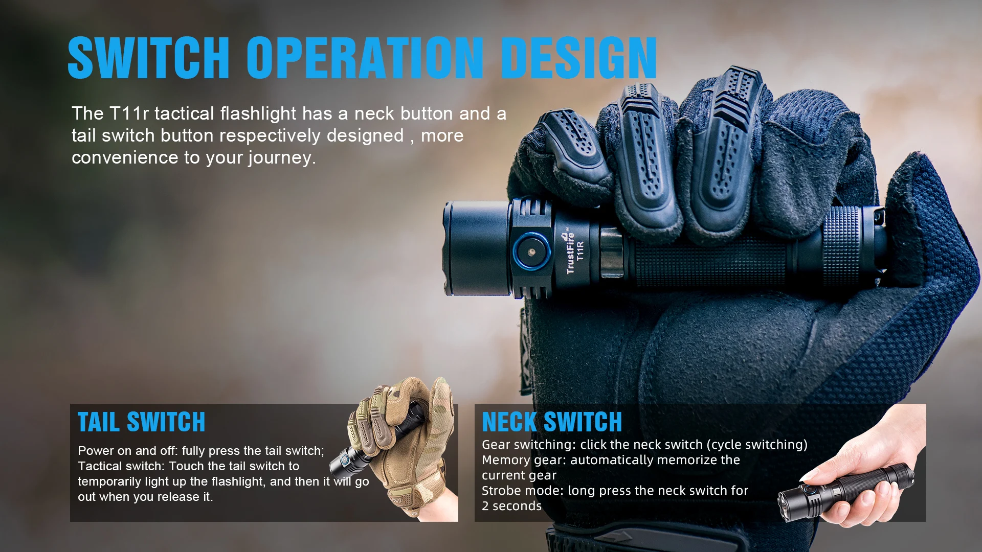 La linterna táctica T11r tiene un botón de cuello y un botón de interruptor trasero diseñados respectivamente, más conveniente para su viaje.