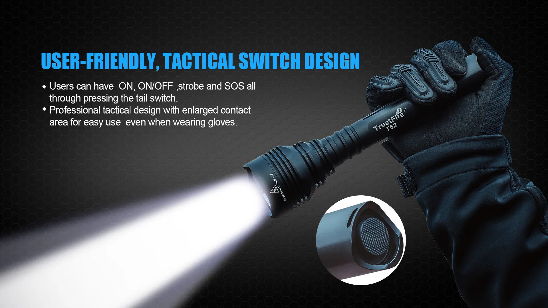 Enlarged contact area for easy use when wearing gloves. Excellent for uses such as camping, search and rescue, or hiking. The tail swtich offers comfortable and easy access to ON/OFF/stobe/SOS