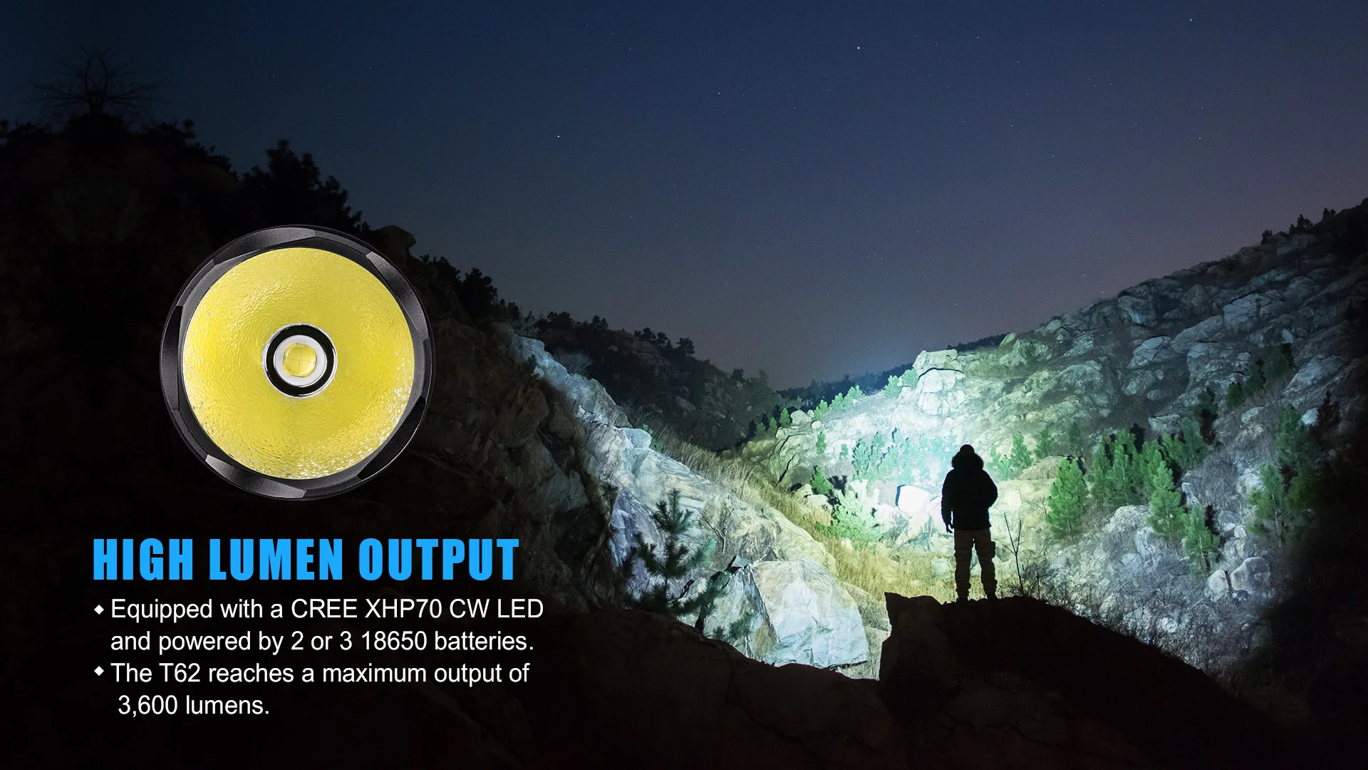 T62 LED flashlight is a perfect choice for night hunters, trappers, farmers, ranchers, fisherman, camping and everyone else who needs a flashlight that can punch a huge hole in the darkness.