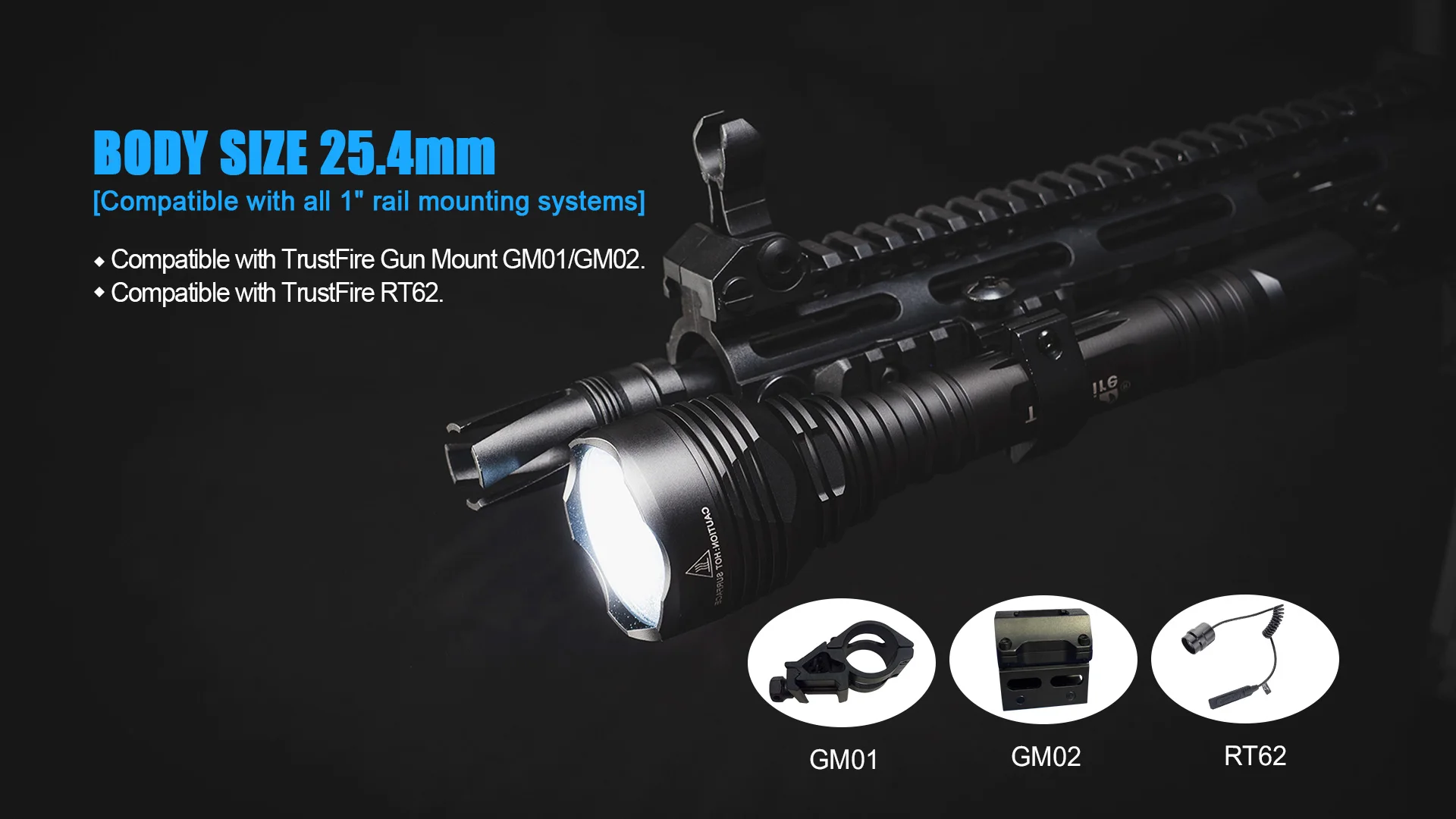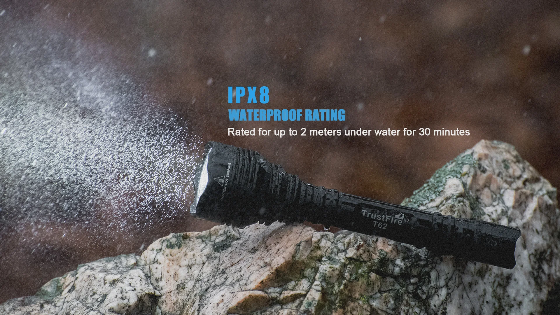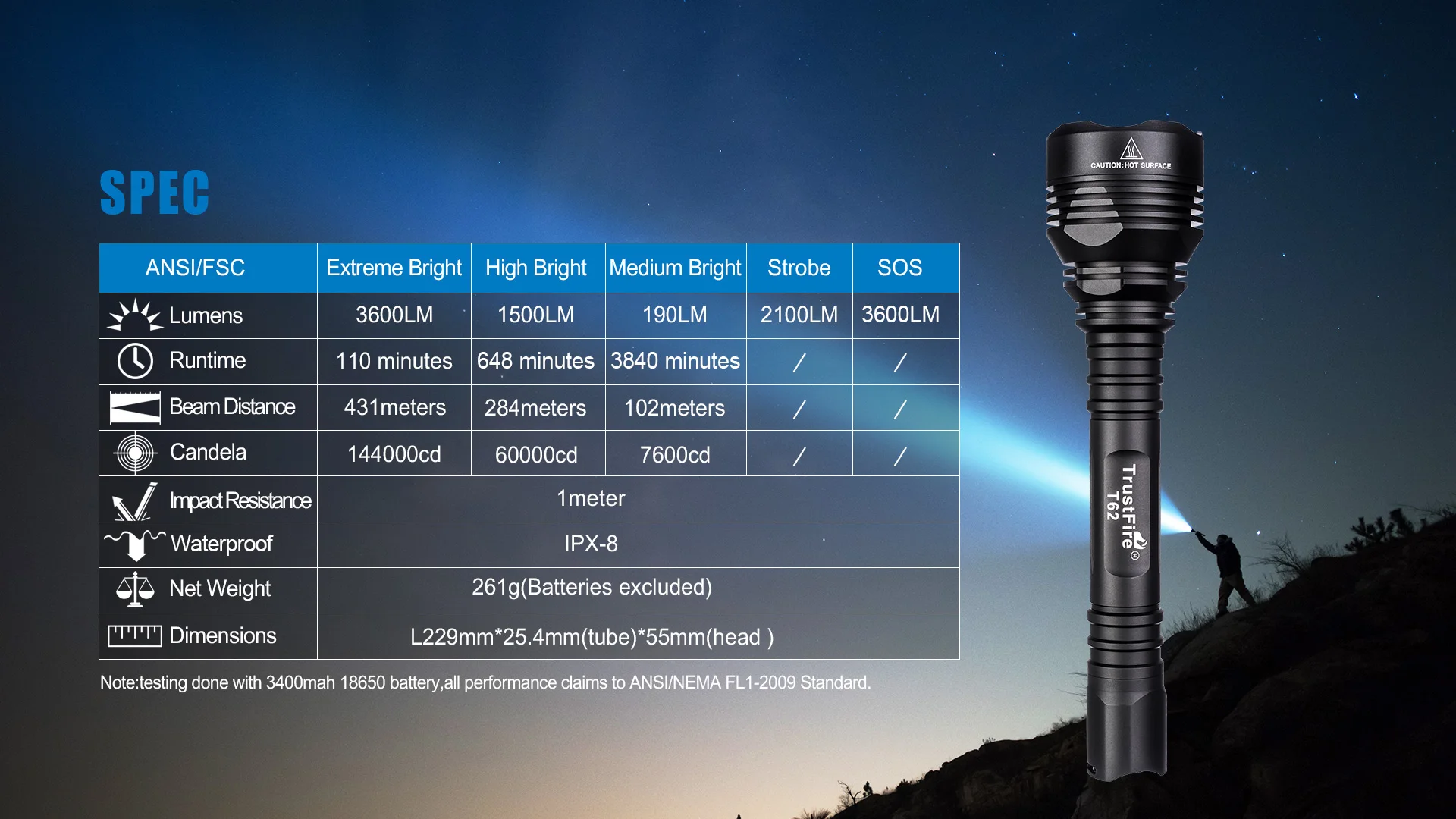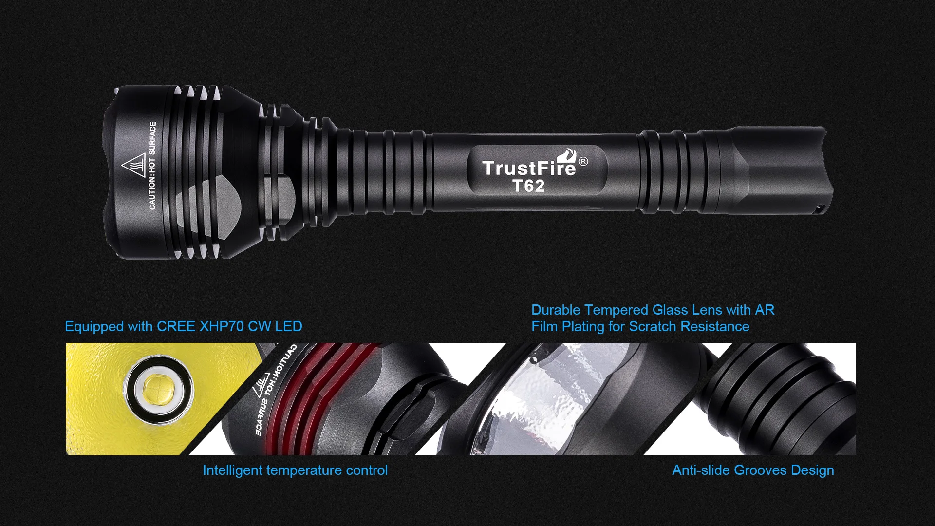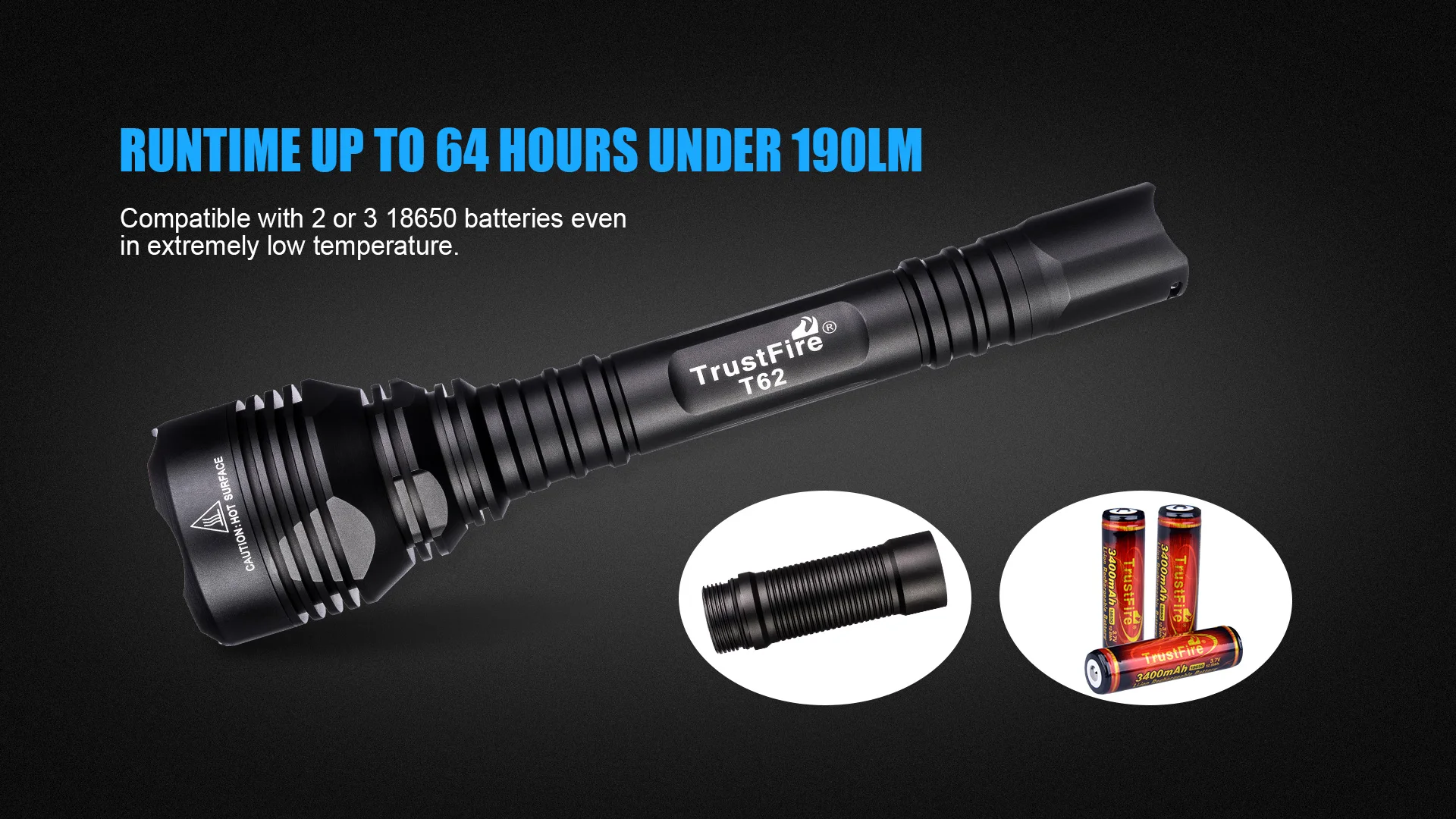 1/TrustFire T62 is designed for Outdoor Sports that has long throw 431 meters and high lumens tactical flashlight.