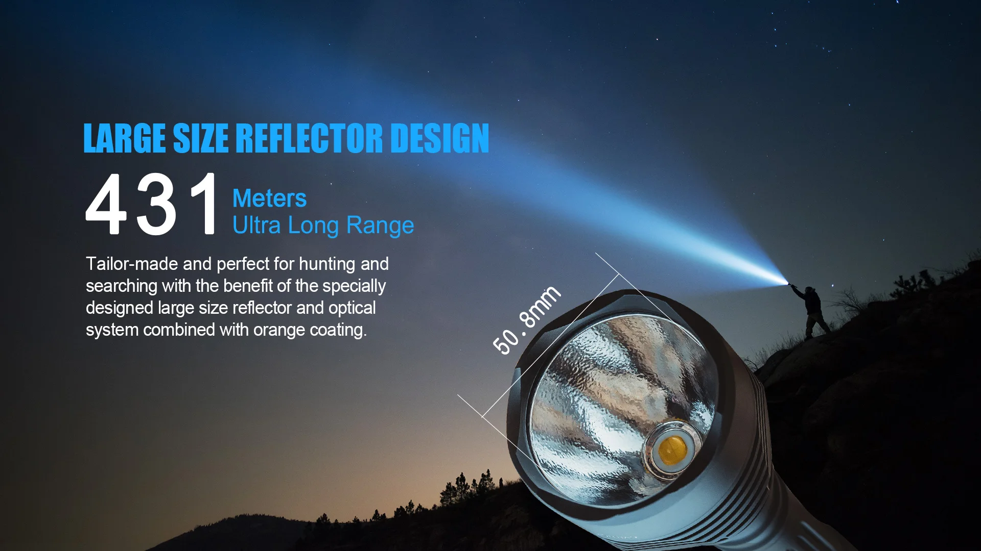Large size reflector and optical system combined with orange coating makes T62 a super balance of 3600 lumens brightness and 431 meters ultra long range.