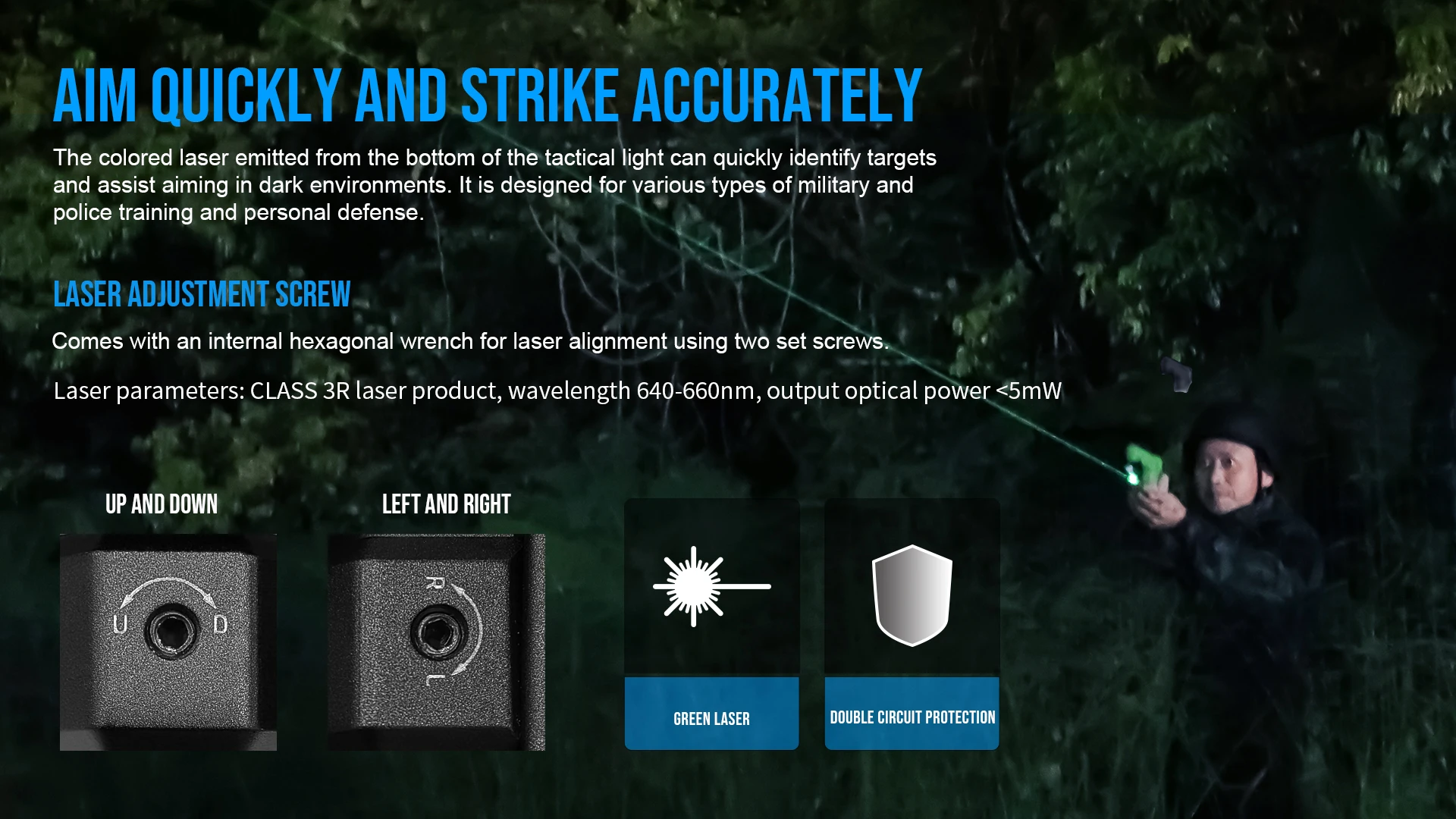 El láser de color emitido desde la parte inferior de la luz táctica puede identificar rápidamente los objetivos y ayudar a apuntar en entornos oscuros. Está diseñado para varios tipos de entrenamiento militar y policial y defensa personal.