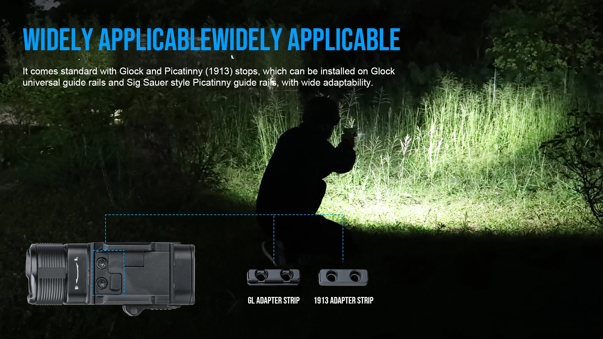 Viene de serie con topes Glock y Picatinny (1913), que se pueden instalar en rieles de guía universales Glock y rieles de guía Picatinny estilo Sig Sauer, con amplia adaptabilidad.