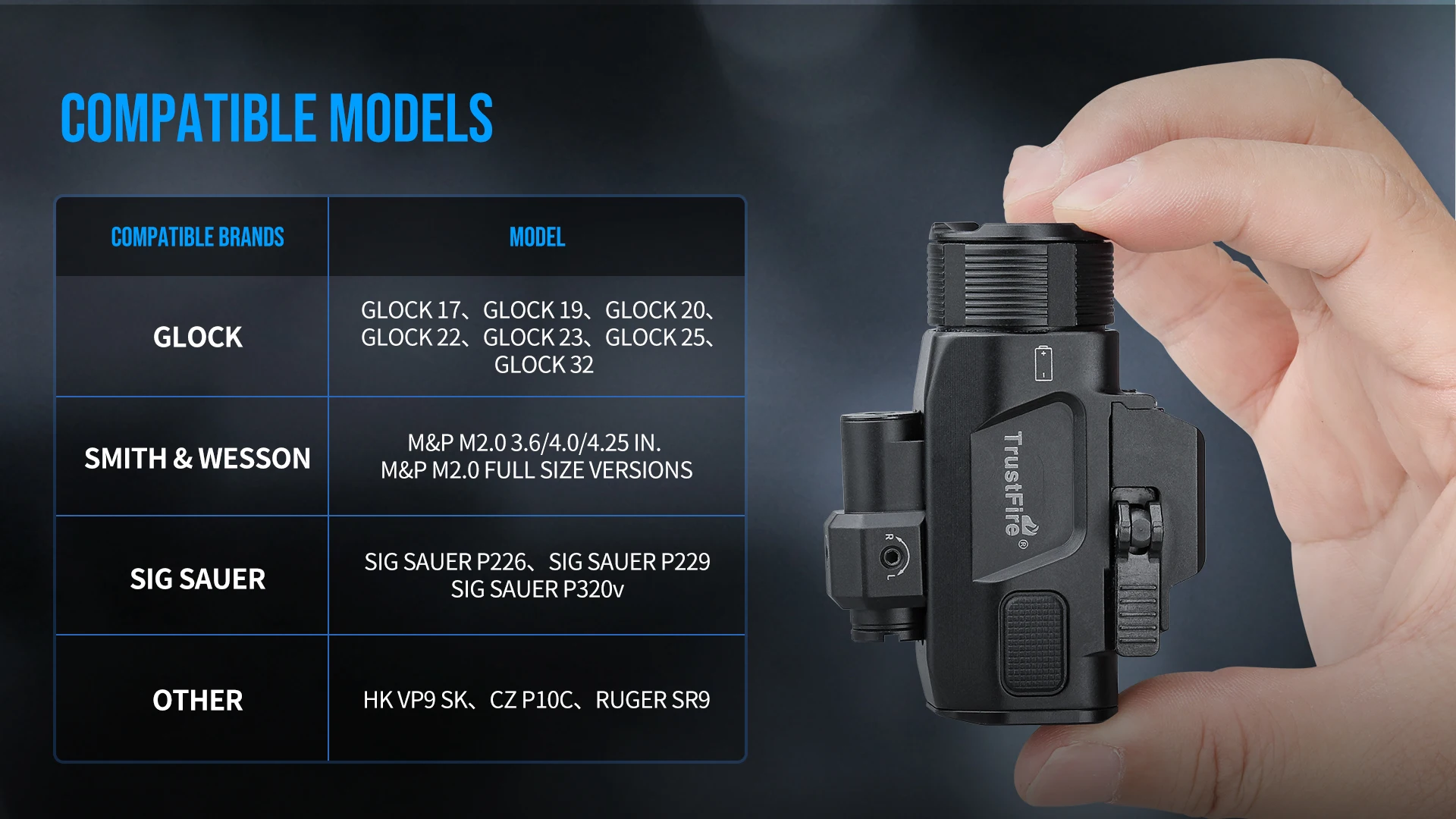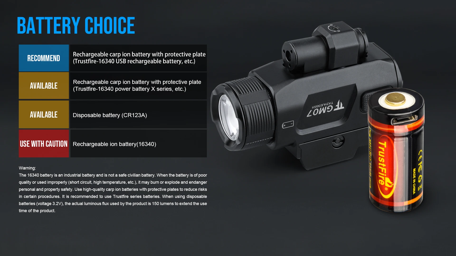 GM07 añade diseño electrónico de modo dual, Modo de uso diarioYC.Láser oloredModo, Con alta fiabilidad y operatividad más fuerte, máximo hasta 1050 lúmenes con un foco completo de láser de color, adecuado para tácticas precisas... P.Operado por una batería de litio recargable 16340, la estructura de carga y descarga única se puede instalar y desmontar rápidamente, y se puede combinar con la mayoría de los clips de pistola en el mercado. IP65 a prueba de polvo e impermeable y pasa 1 metro anticaída, se puede usar de forma segura en el ambiente al aire libre.
