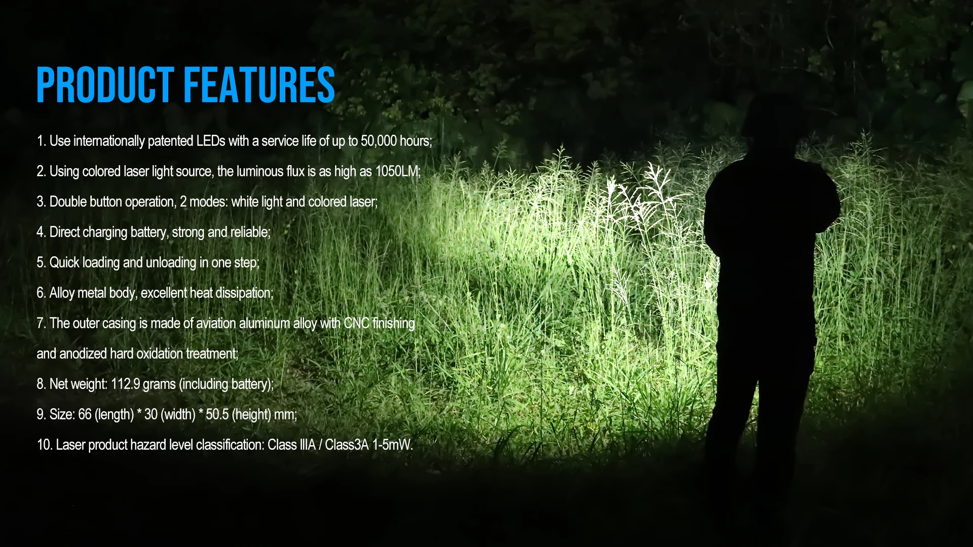 Modo de luz blanca: brillo 1050 lúmenes, tiempo de ejecución 55 minutos, rango de haz 128 metros, 4096CD