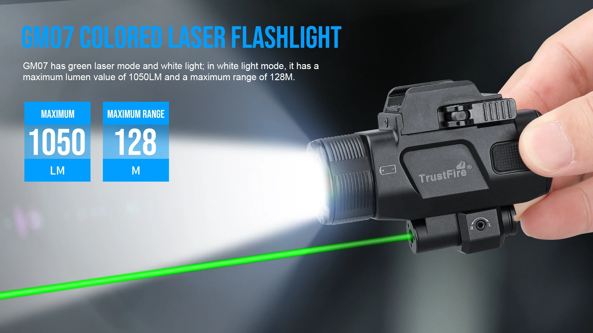 GM07 tiene modo láser verde y luz blanca; en modo de luz blanca, tiene un valor de lumen máximo de 1050LM y un alcance máximo de 128M.