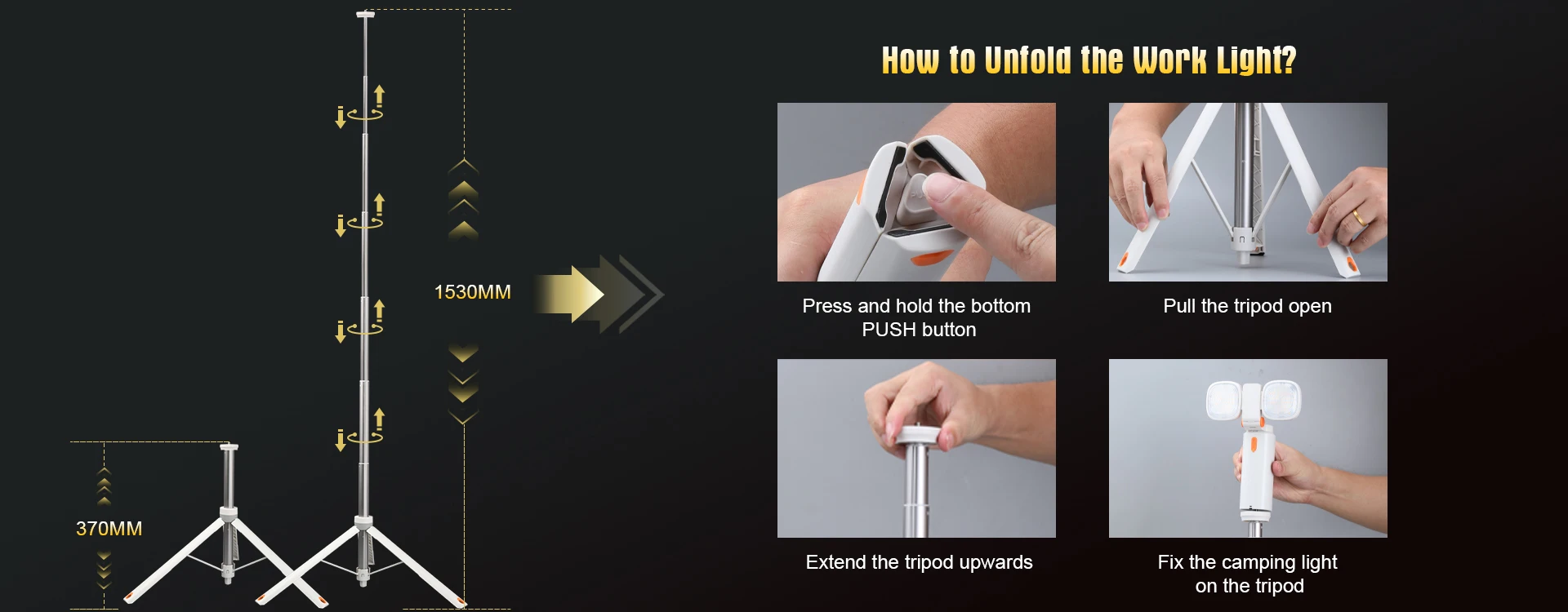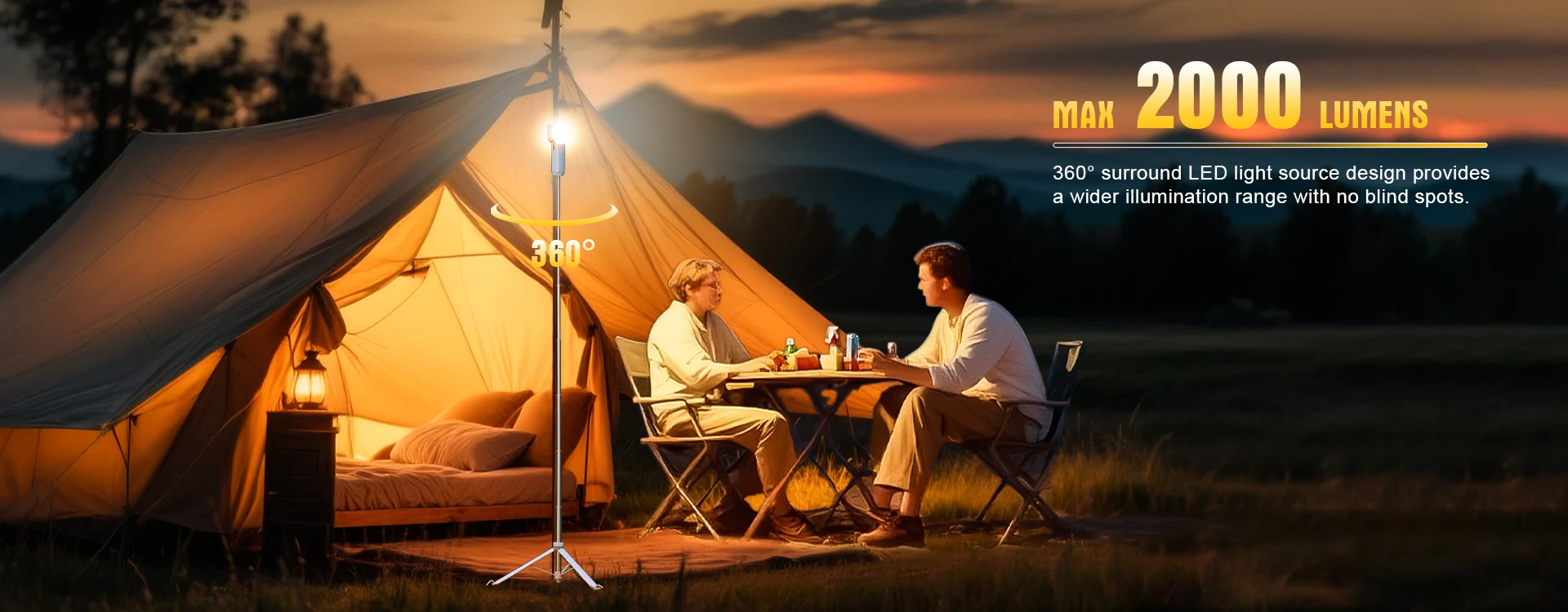 ILUMINACIÓN MULTÁNGULO-180° rotación vertical +90° ajuste horizontal, control preciso del ángulo de la luz, cobertura flexible de múltiples escenarios de iluminación como tiendas de campaña, campamentos, caminos, etc.