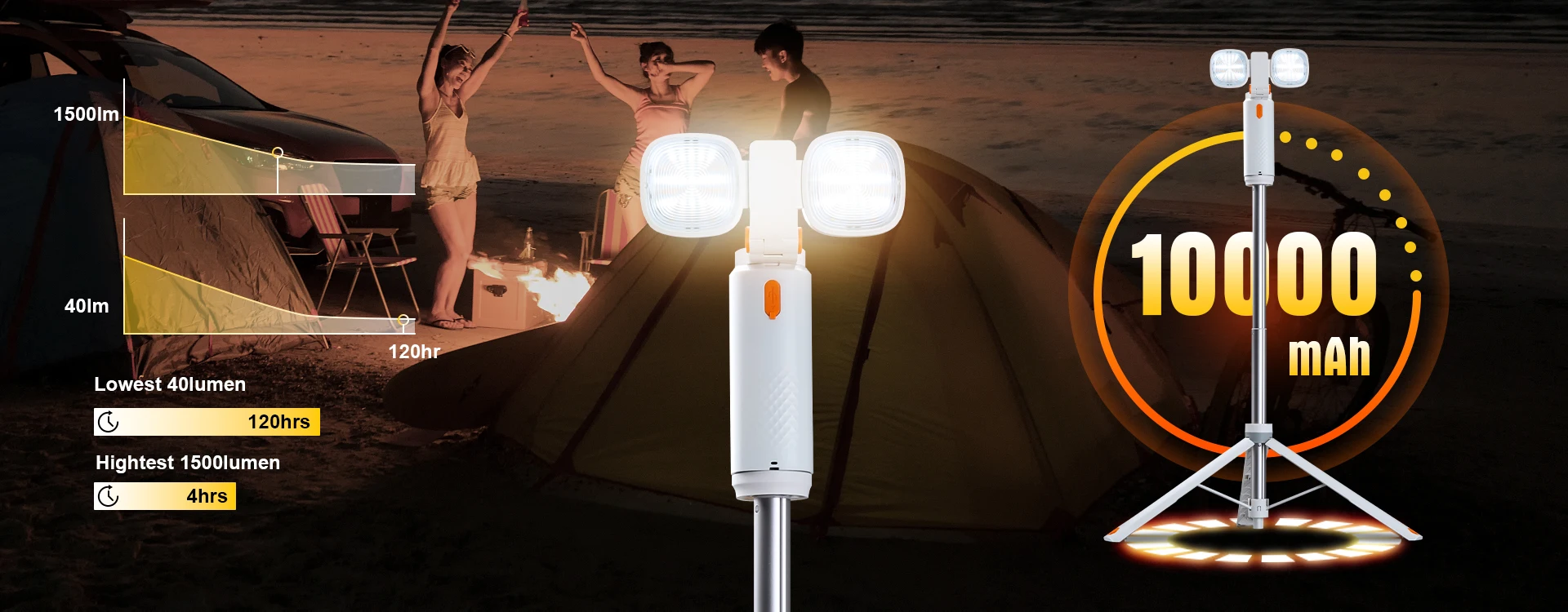 Alimentado por una enorme batería de 10.000 mAh, ofrece 120 horas (5 días) de iluminación continua a 40 lúmenes con bajo brillo y 4 horas de brillo en ráfaga de 1.500 lúmenes con alto brillo.Dígale adiós a las preocupaciones sobre la duración de la batería y disfrute de una iluminación duradera.