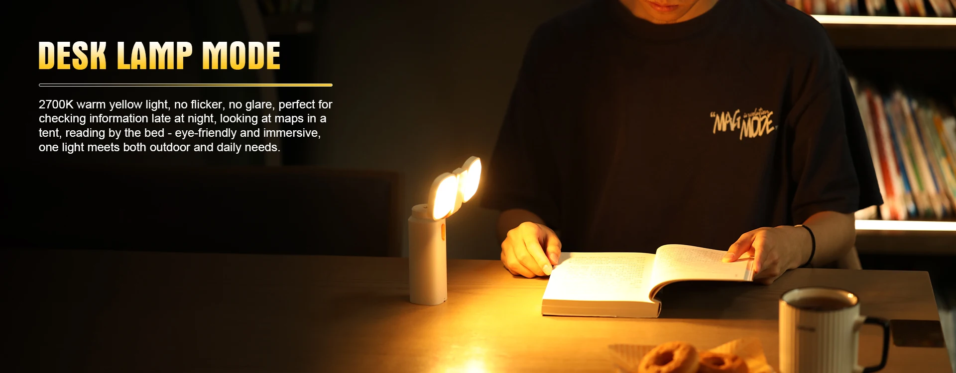 MODO DE LÁMPARA DE ESCRITORIO: luz amarilla cálida de 2700 K, sin parpadeo, sin reflejos, perfecta para verificar información a altas horas de la noche, mirar mapas en una tienda de campaña, leer junto a la cama: agradable a la vista e inmersiva, una luz satisface las necesidades diarias y al aire libre.
