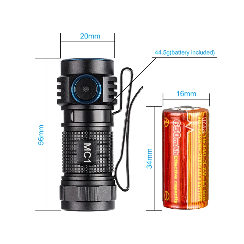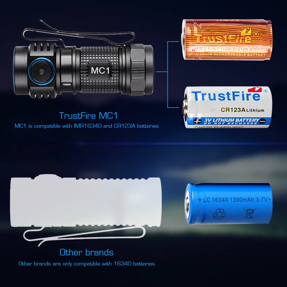 MC1 tiene múltiples opciones de batería: baterías de iones de litio 16340, RCR123A de 3,7 V, 3 V CR123A