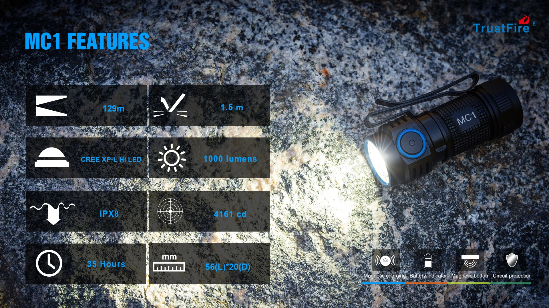 Trustfire MC1 fabricado con alta tecnología: utiliza la tecnología MAX Vision Beam y el grosor de la lente es de solo 1,5 mm, lente ultrafina, la eficiencia de transmisión de la luz es de hasta el 90%