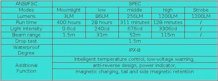 1/Alimentado por 1*18650 o 2*CR123A, 400 horas de funcionamiento en modo luz de luna.