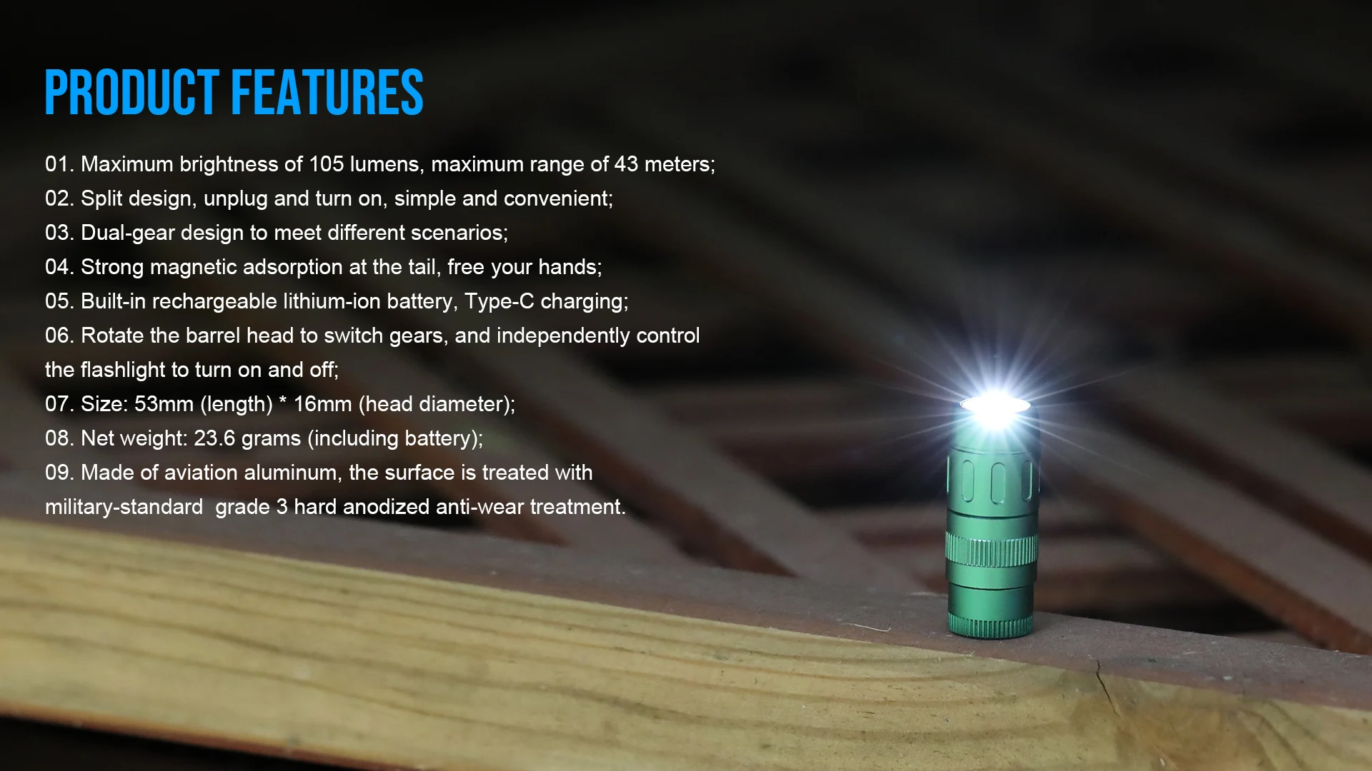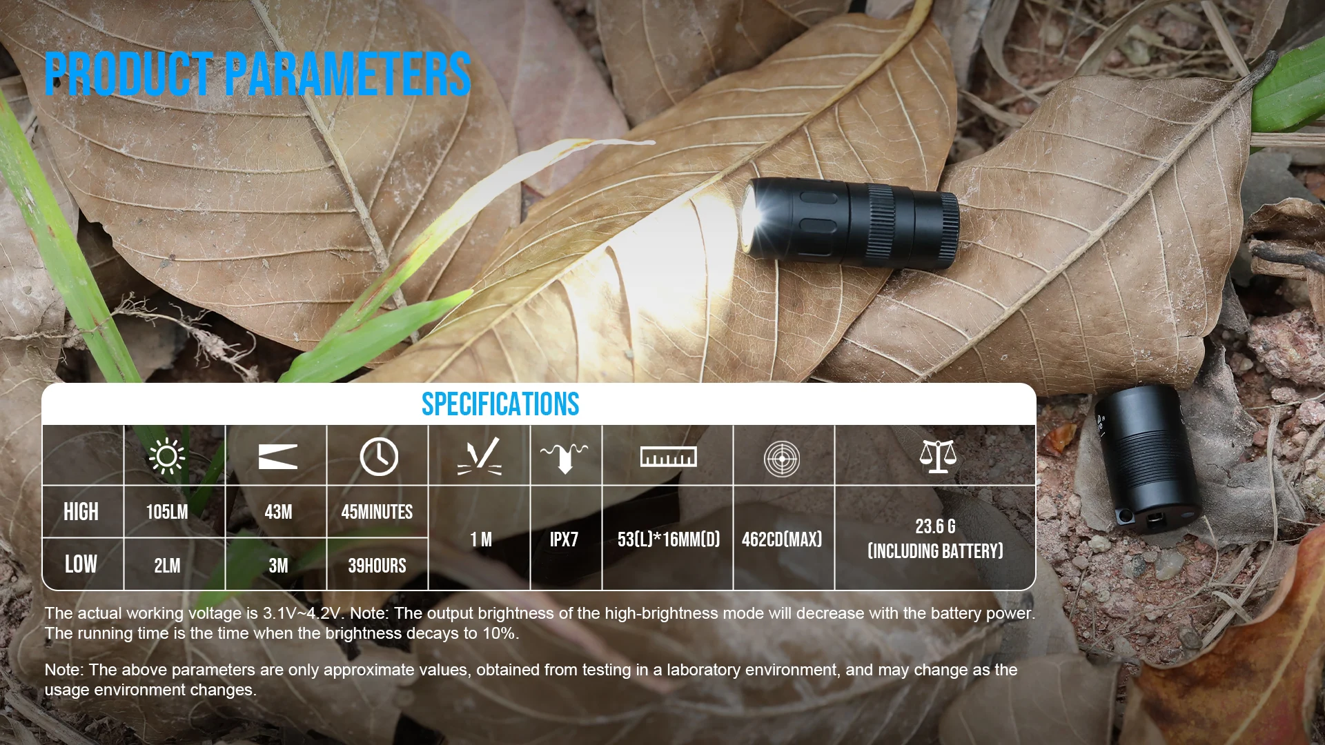 01. Brillo máximo de 105 lúmenes, alcance máximo de 43 metros