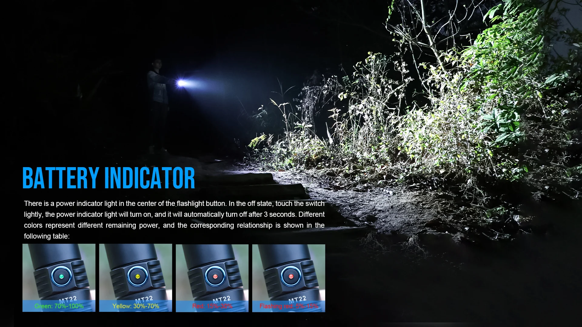 There is a power indicator light in the center of the flashlight button. in the off state, touch the switch lightly, the power indicator light will tum on, and it will automatically tum off after 3 seconds. Different colors represent different remaining power.and the coresponding relationship is shown in the following table:
