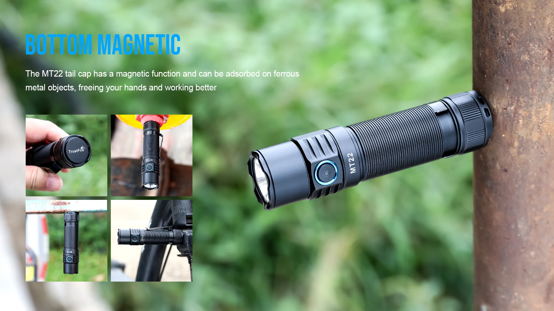 The MT22 tail cap has a magnetic function and can be adsorbed on ferrousmetal objects, freeing your hands and working better