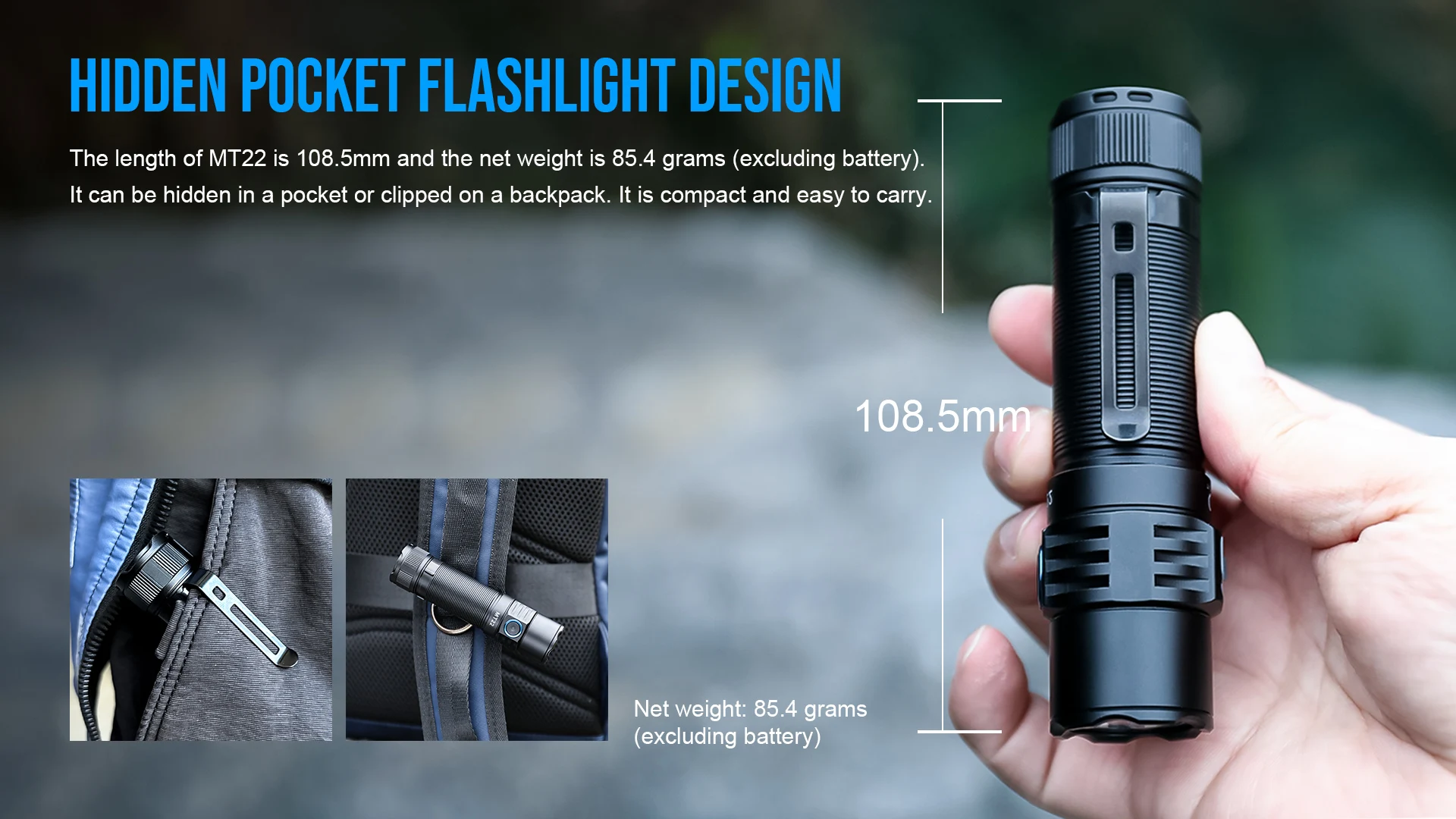 The length of MT22 is 108.5mm and the net weight is 85.4 grams (excluding battery).