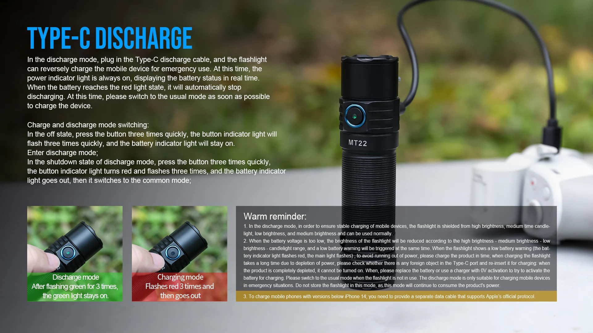 2. When the battery votage is too low, the bnightness of the flasthlight wil be reduced according to the high brightness - medium brightness - lowbnghtness - candlelight range, and a low batteny waming wil be tnggered at the same time. When the flashlight shows a low battery warming (the battery indicator light flashes red, the main ight lashes), to avoid running out of power, please charge the product in time, when charging the fiashighitakes a long time due to depletion of power, please check whether there is any foreign object in the Type-C por and re-insert it for charging: whenthe product is completely depleted.it cannot be tumed on. When, please replace the batery or use a charger with 0V activalion to try to activate thebatery for charging.Please switch to the usual mode when the fashight is not in use. The discharge mode is only suitable for charging mobile devicesin emeraency situations. Do not store the fiashlioht in this mode. as this mode wilcontinue to consume the product's power.