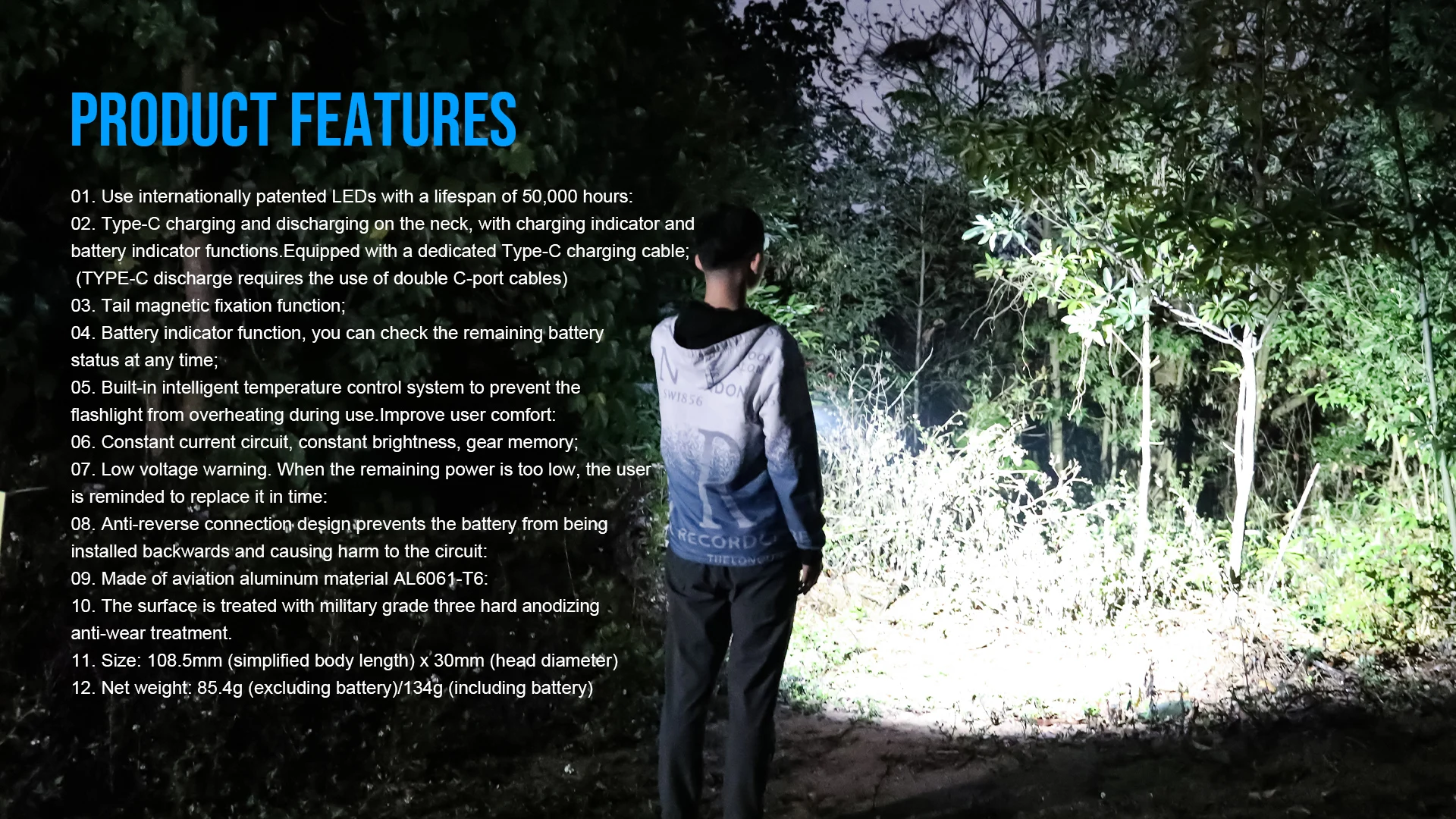 05, Built-in intelligent temperature control system to prevent the flashlight from overheating during use. lmprove user comfort: