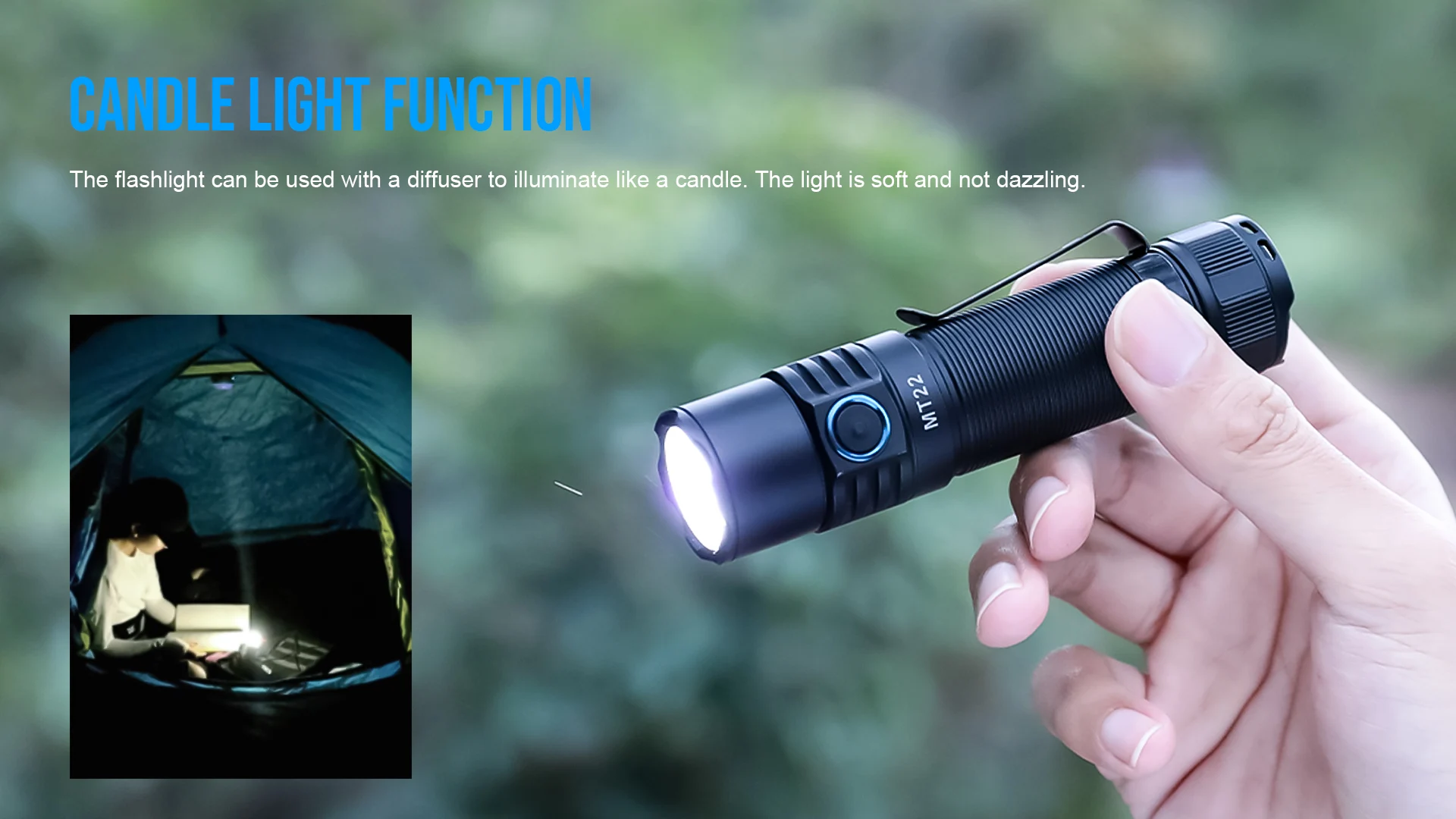 The flashlight can be used with a diffuser to illuminate like a candle. The light is soft and not dazzling.