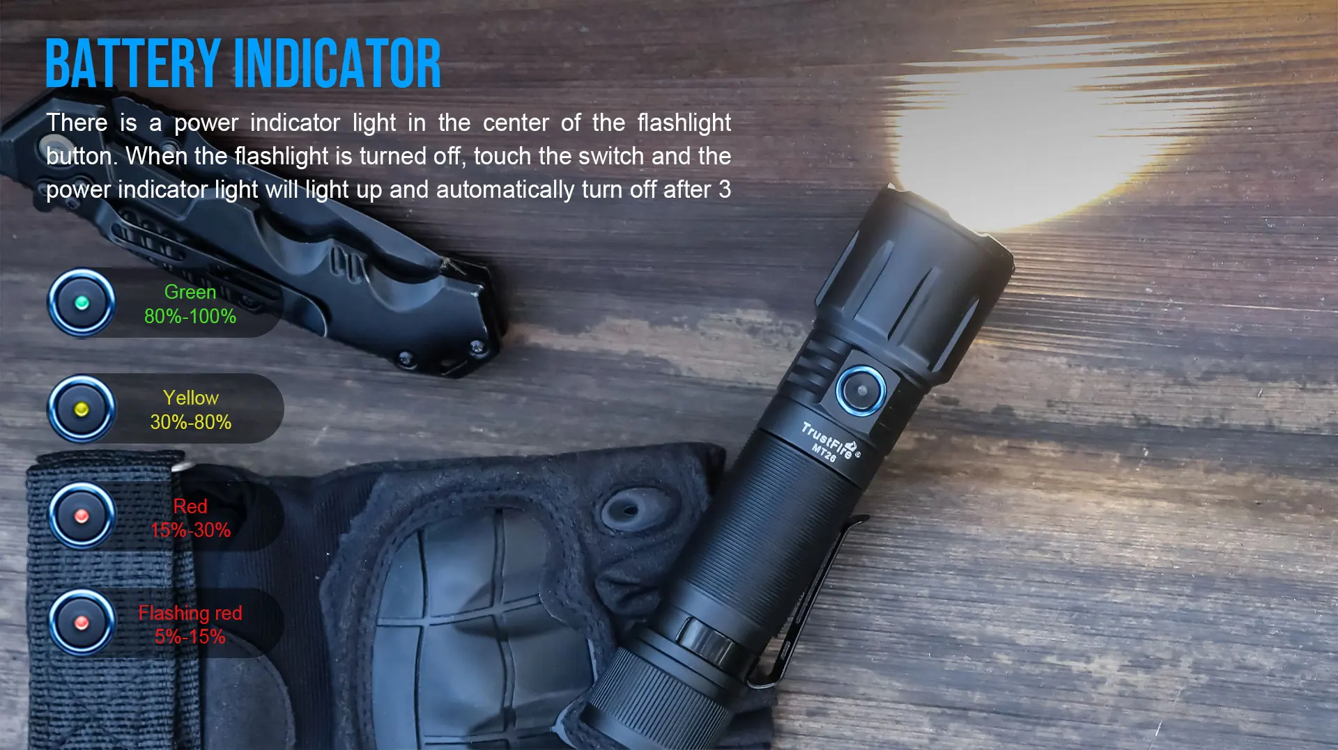 Hay una luz indicadora de encendido en el centro del botón de la linterna. Cuando la linterna esté apagada, toque el interruptor y la luz indicadora de encendido se encenderá y se apagará automáticamente después de 3 segundos.