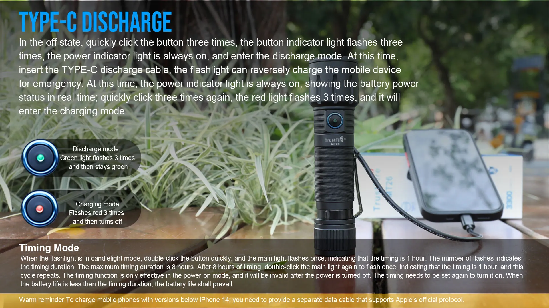 En el estado apagado, haga clic rápidamente en el botón tres veces, la luz indicadora del botón parpadea tres veces, la luz indicadora de encendido siempre está encendida e ingresa al modo de descarga.En este momento, inserte el cable de descarga TYPE-C, la linterna puede cargar el dispositivo móvil de forma inversa en caso de emergencia.En este momento, la luz indicadora de alimentación siempre está encendida, mostrando el estado de energía de la batería en tiempo real, haga clic rápidamente tres veces nuevamente, la luz roja parpadea 3 veces y entrará en el modo de carga.