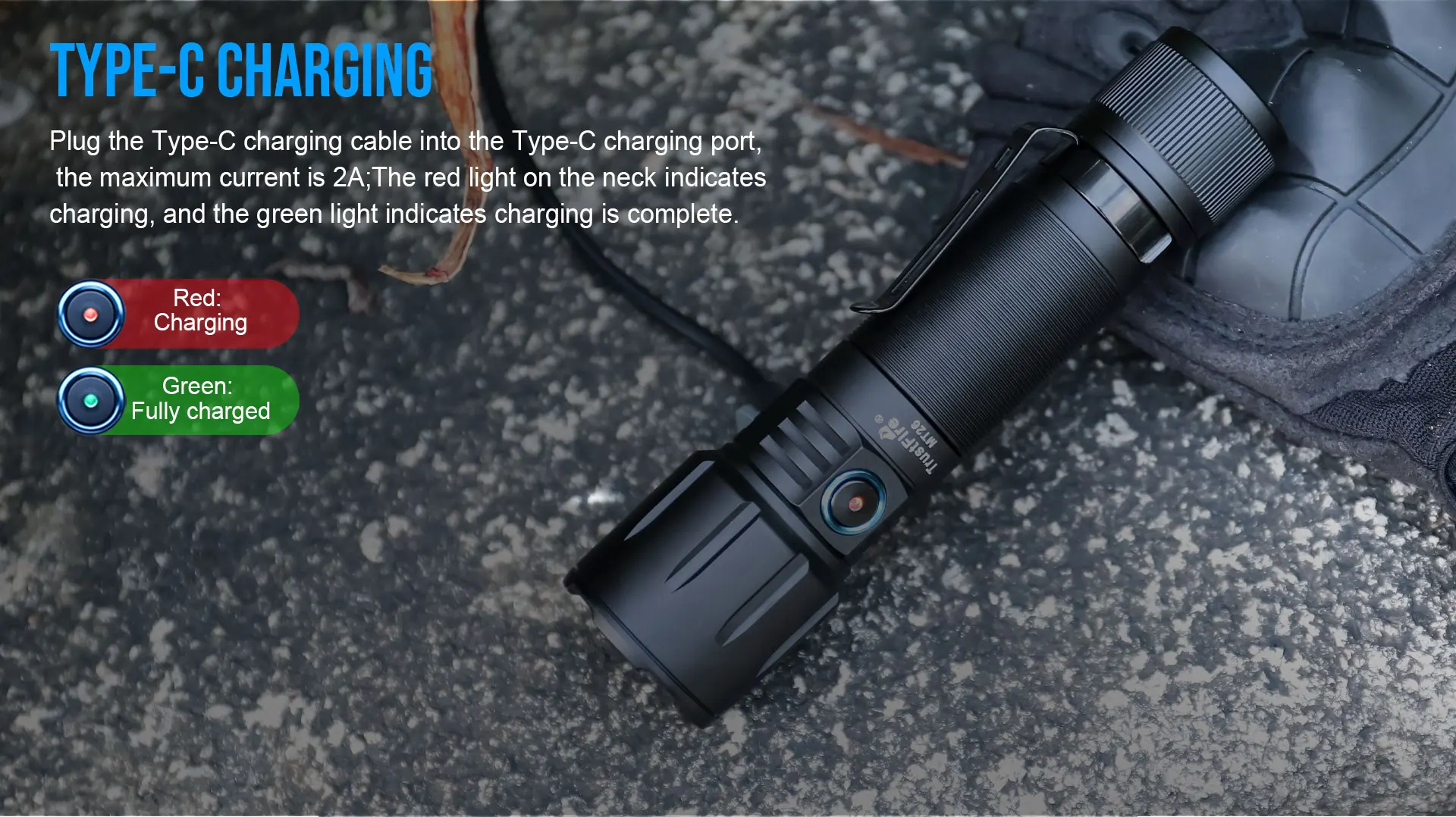 Conecte el cable de carga tipo C al puerto de carga tipo C, la corriente máxima es 2 A, la luz roja en el cuello indica la carga y la luz verde indica que la carga está completa.