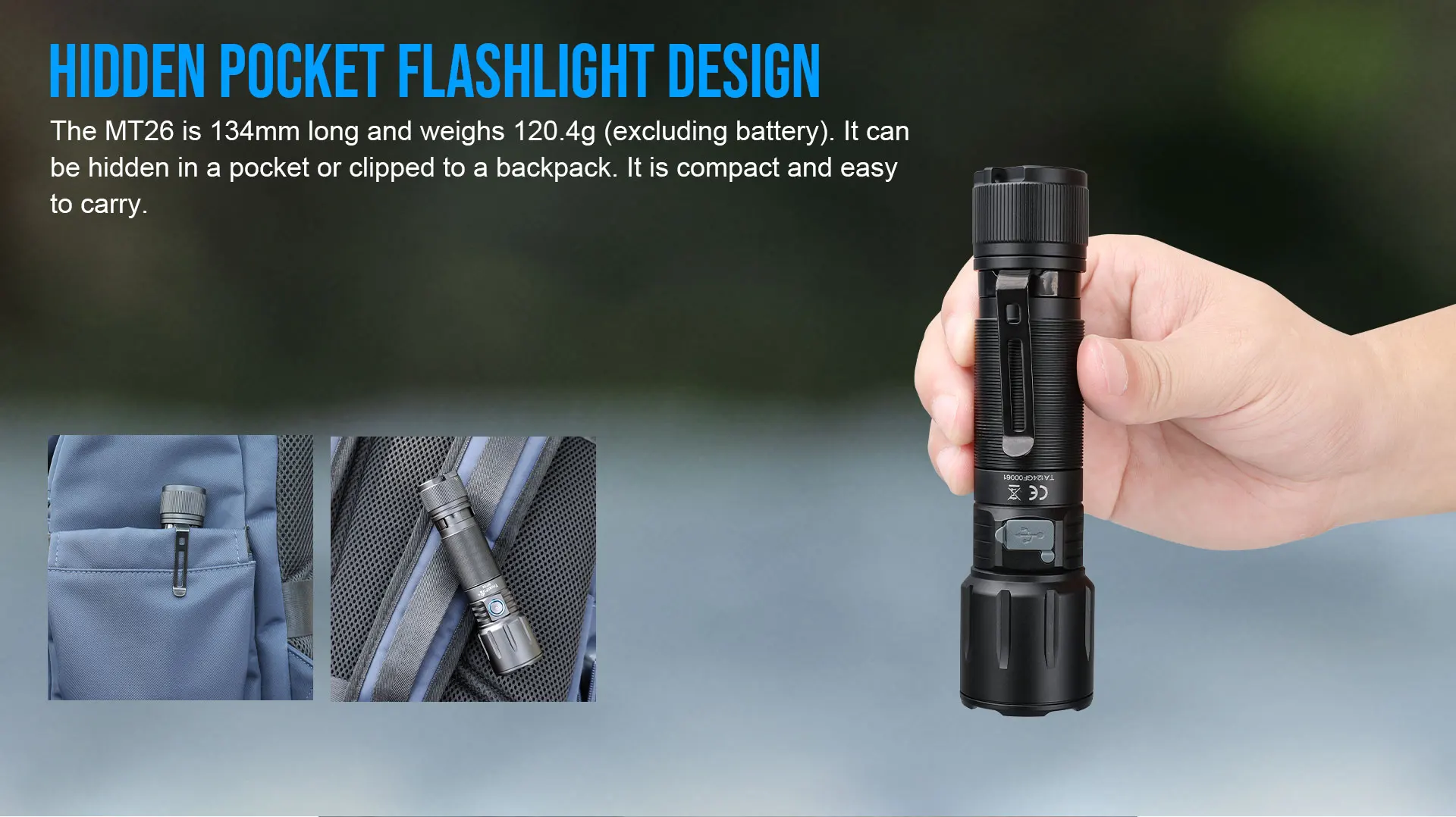 El MT26 mide 134 mm de largo y pesa 120,4 g (sin batería).Se puede ocultar en un bolsillo o sujetar a una mochila.Es compacto y fácil de transportar.