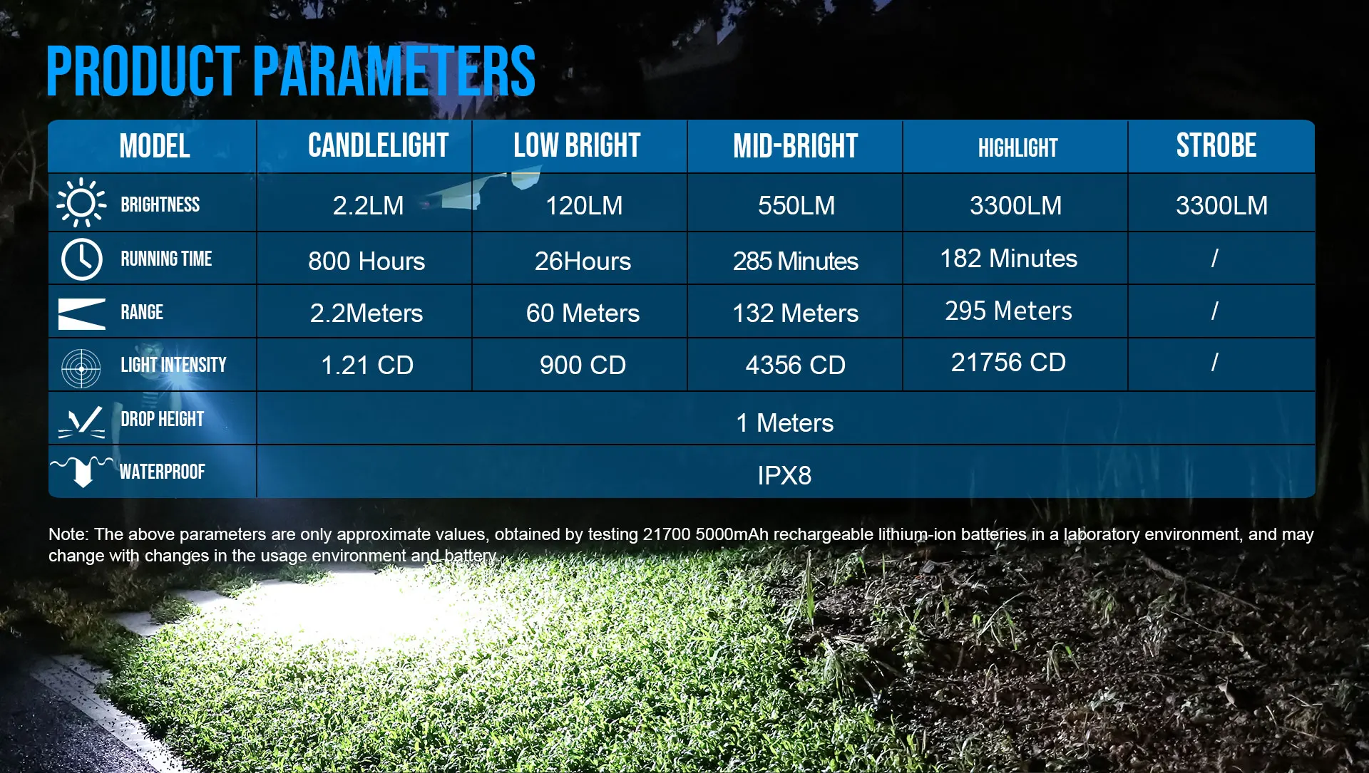 Brillo máximo: 300 lúmenes; Alcance máximo del haz 295 metros