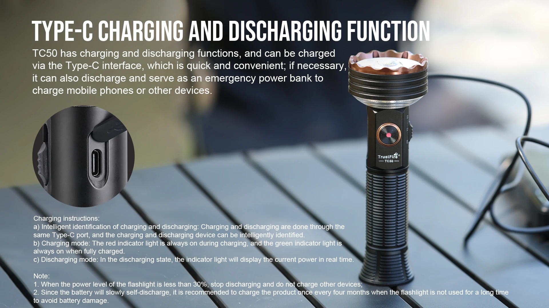 TC50 tiene funciones de carga y descarga y se puede cargar a través de la interfaz tipo C, que es rápida y conveniente; Si es necesario, también puede descargarse y servir como banco de energía de emergencia para cargar teléfonos móviles u otros dispositivos.