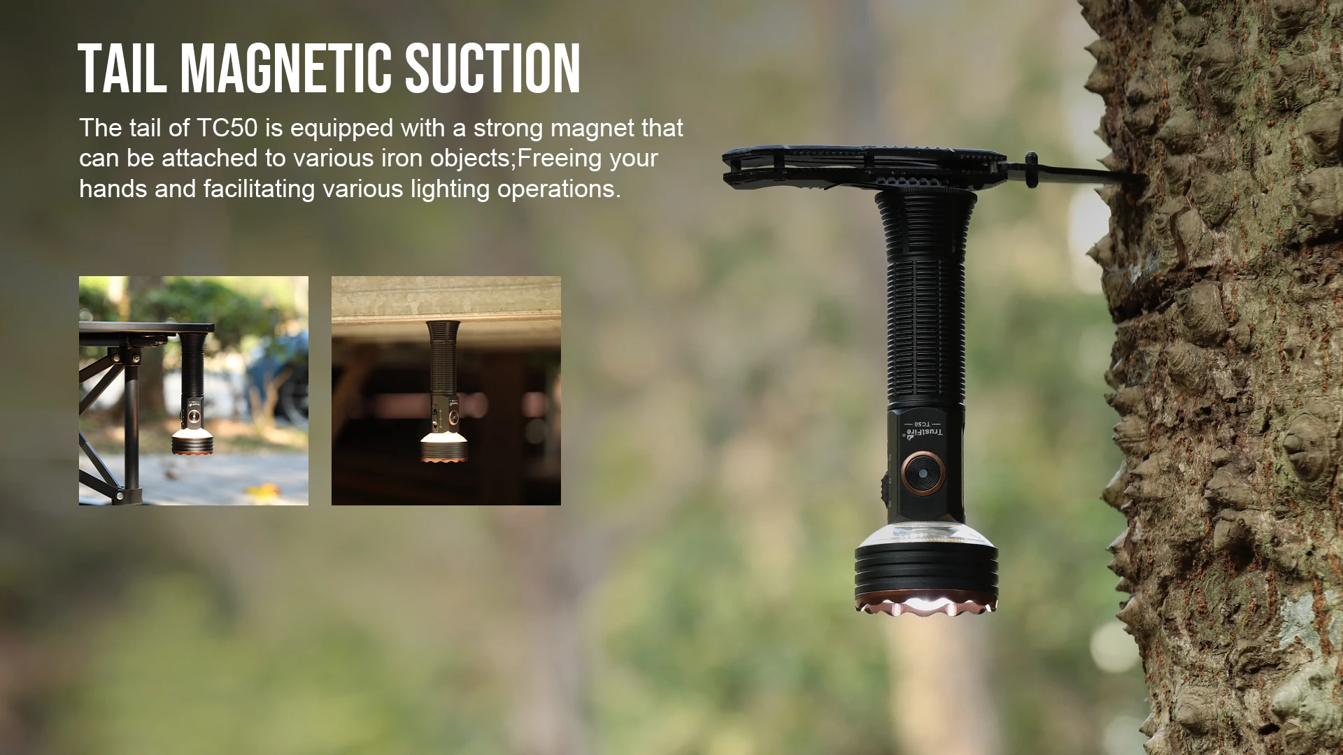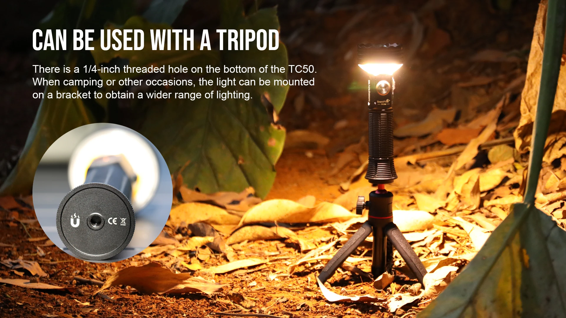 Hay un orificio roscado de 1/4 de pulgada en la parte inferior del TC50.Al acampar u otras ocasiones, la luz se puede montar en un soporte para obtener una gama más amplia de iluminación.