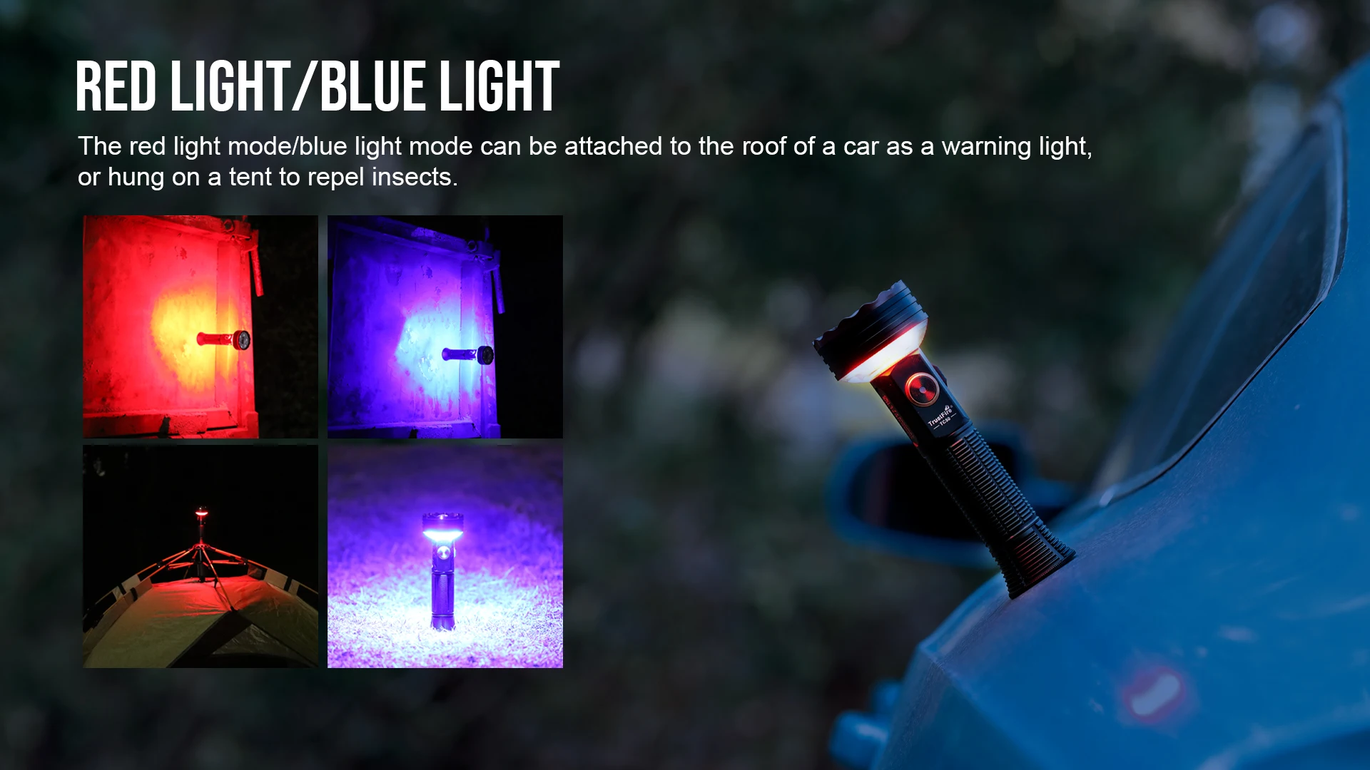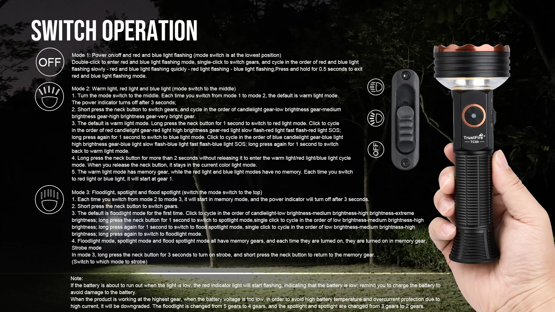 • El modo de luz cálida tiene equipo de memoria, mientras que los modos de luz roja y luz azul no tienen memoria.Cada vez que cambie a luz roja o azul, comenzará en la marcha 1.