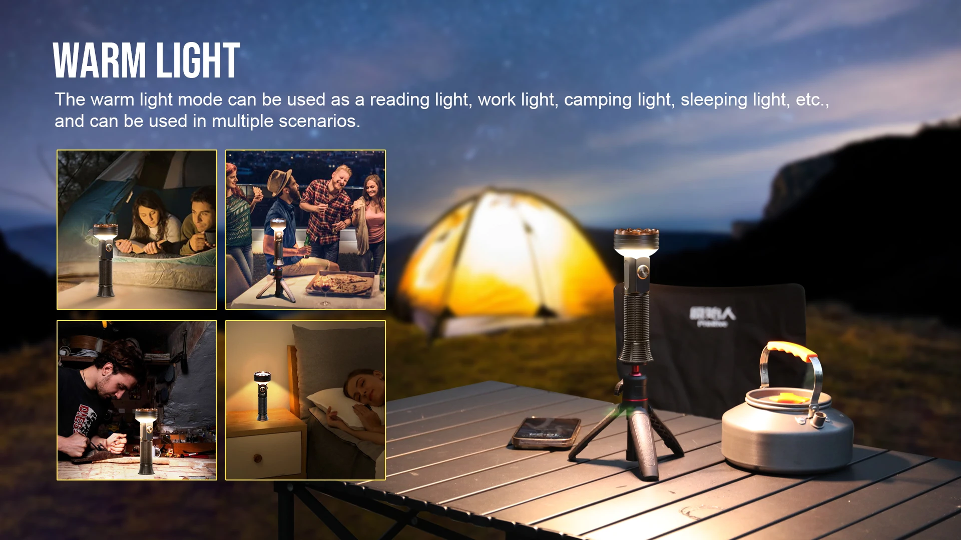 El modo de luz cálida se puede utilizar como luz de lectura, luz de trabajo, luz de camping, luz para dormir, etc., y se puede utilizar en múltiples escenarios.
